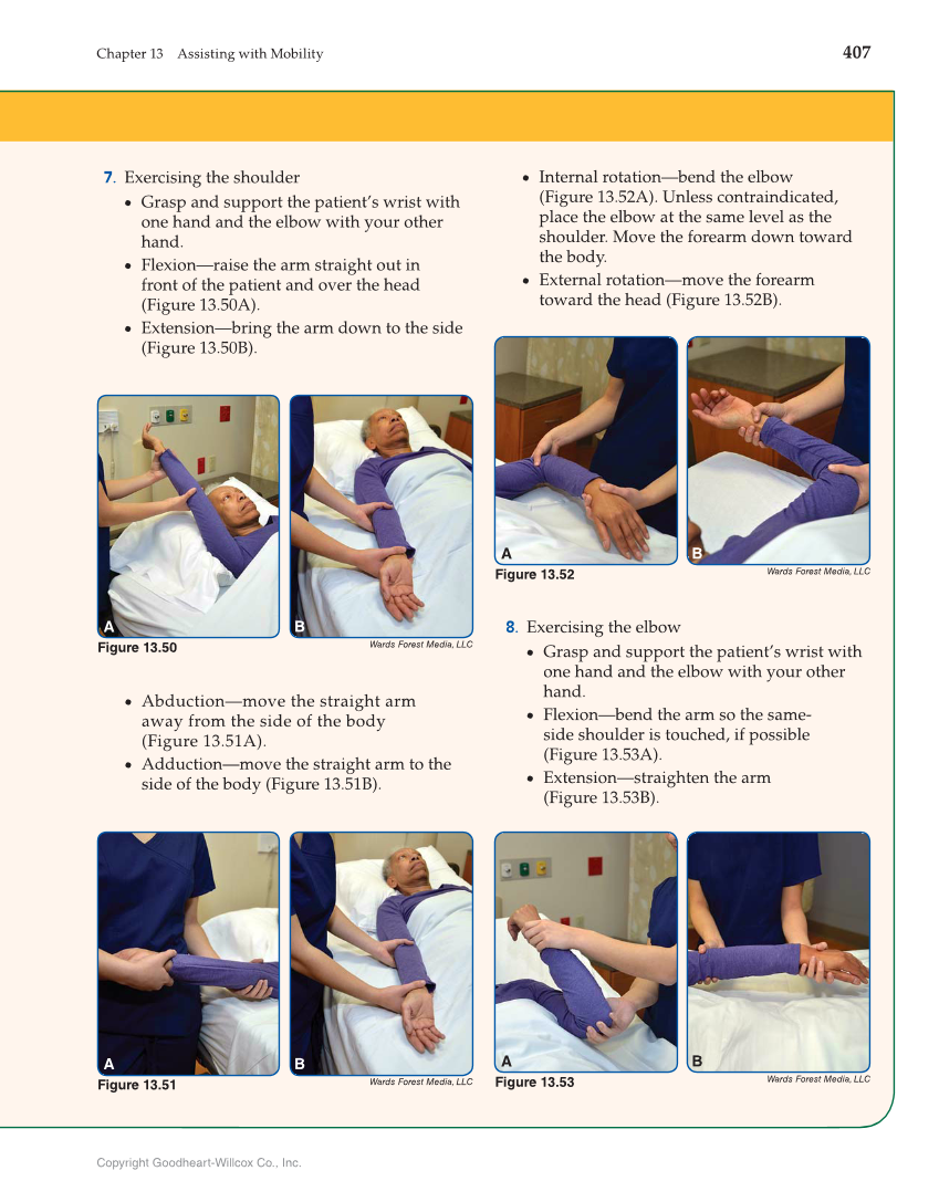 Chapter 13 Assisting with Mobility 407 Copyright Goodheart-Willcox Co., Inc. 8. Exercising the elbow • Grasp and support the patient’s wrist with one hand and the elbow with your other hand. • Flexion—bend the arm so the same- side shoulder is touched, if possible (Figure 13.53A). • Extension—straighten the arm (Figure 13.53B). 7. Exercising the shoulder • Grasp and support the patient’s wrist with one hand and the elbow with your other hand. • Flexion—raise the arm straight out in front of the patient and over the head (Figure 13.50A). • Extension—bring the arm down to the side (Figure 13.50B). Wards Forest Media, LLC Figure 13.52 A B Wards Forest Media, LLC Figure 13.53 A B • Abduction—move the straight arm away from the side of the body (Figure 13.51A). • Adduction—move the straight arm to the side of the body (Figure 13.51B). Wards Forest Media, LLC Figure 13.50 A B Wards Forest Media, LLC Figure 13.51 A B • Internal rotation—bend the elbow (Figure 13.52A). Unless contraindicated, place the elbow at the same level as the shoulder. Move the forearm down toward the body. • External rotation—move the forearm toward the head (Figure 13.52B).