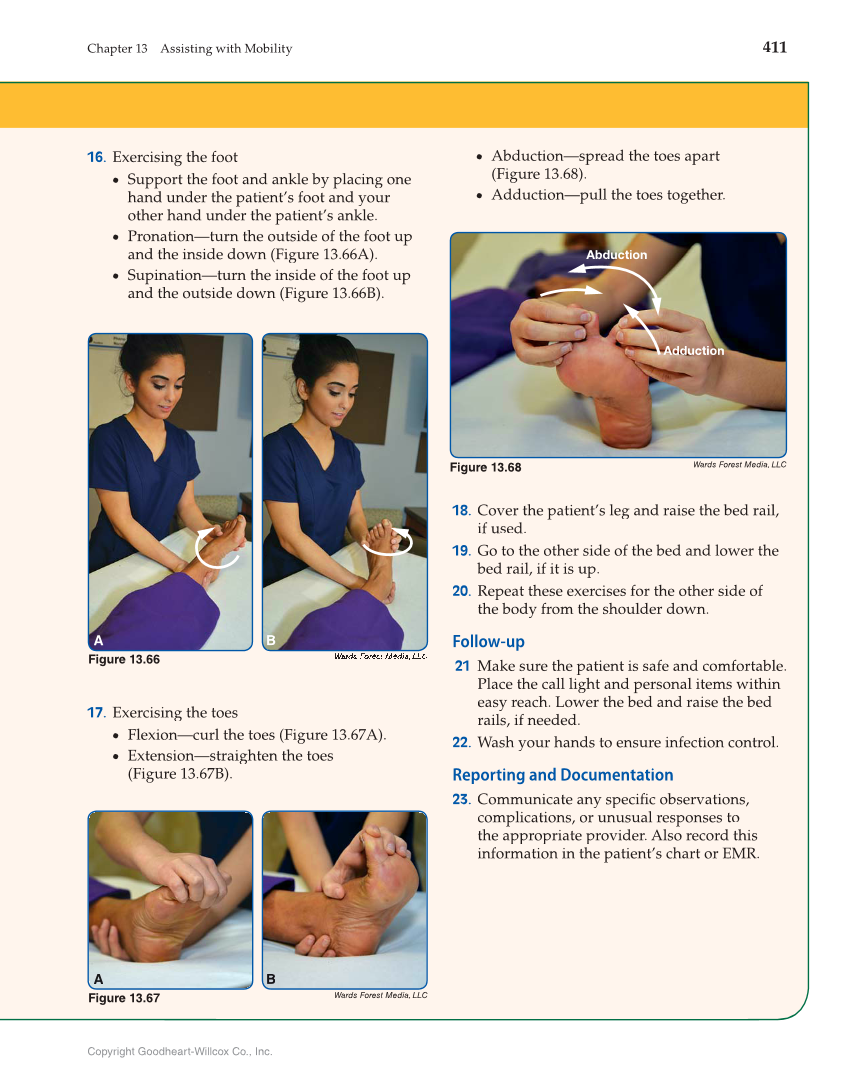Chapter 13 Assisting with Mobility 411 Copyright Goodheart-Willcox Co., Inc. 17. Exercising the toes • Flexion—curl the toes (Figure 13.67A). • Extension—straighten the toes (Figure 13.67B). • Abduction—spread the toes apart (Figure 13.68). • Adduction—pull the toes together. Figure 13.66 A B 16. Exercising the foot • Support the foot and ankle by placing one hand under the patient’s foot and your other hand under the patient’s ankle. • Pronation—turn the outside of the foot up and the inside down (Figure 13.66A). • Supination—turn the inside of the foot up and the outside down (Figure 13.66B). Wards Forest Media, LLC Figure 13.67 A A A A A A A A B B B B Abduction Adduction Wards Forest Media, LLC Figure 13.68 18. Cover the patient’s leg and raise the bed rail, if used. 19. Go to the other side of the bed and lower the bed rail, if it is up. 20. Repeat these exercises for the other side of the body from the shoulder down. Follow-up 21 Make sure the patient is safe and comfortable. Place the call light and personal items within easy reach. Lower the bed and raise the bed rails, if needed. 22. Wash your hands to ensure infection control. Reporting and Documentation 23. Communicate any specific observations, fi complications, or unusual responses to the appropriate provider. Also record this information in the patient’s chart or EMR.
