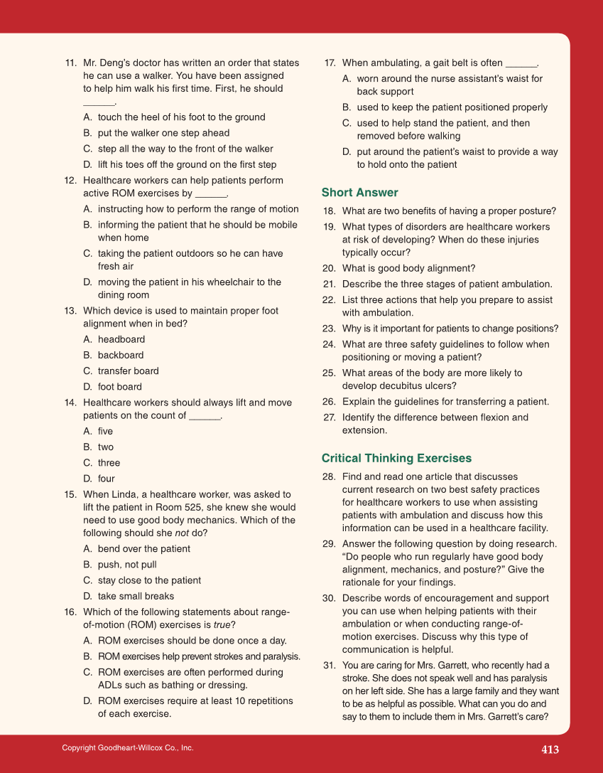 413 11. Mr. Deng’s doctor has written an order that states he can use a walker. You have been assigned to help him walk his first time. First, he should ______. A. touch the heel of his foot to the ground B. put the walker one step ahead C. step all the way to the front of the walker D. lift his toes off the ground on the first step 12. Healthcare workers can help patients perform active ROM exercises by ______. A. instructing how to perform the range of motion B. informing the patient that he should be mobile when home C. taking the patient outdoors so he can have fresh air D. moving the patient in his wheelchair to the dining room 13. Which device is used to maintain proper foot alignment when in bed? A. headboard B. backboard C. transfer board D. foot board 14. Healthcare workers should always lift and move patients on the count of ______. A. five B. two C. three D. four 15. When Linda, a healthcare worker, was asked to lift the patient in Room 525, she knew she would need to use good body mechanics. Which of the following should she not do? A. bend over the patient B. push, not pull C. stay close to the patient D. take small breaks 16. Which of the following statements about range- of-motion (ROM) exercises is true? A. ROM exercises should be done once a day. B. ROM exercises help prevent strokes and paralysis. C. ROM exercises are often performed during ADLs such as bathing or dressing. D. ROM exercises require at least 10 repetitions of each exercise. 17. When ambulating, a gait belt is often ______. A. worn around the nurse assistant’s waist for back support B. used to keep the patient positioned properly C. used to help stand the patient, and then removed before walking D. put around the patient’s waist to provide a way to hold onto the patient Short Answer 18. What are two benefits of having a proper posture? 19. What types of disorders are healthcare workers at risk of developing? When do these injuries typically occur? 20. What is good body alignment? 21. Describe the three stages of patient ambulation. 22. List three actions that help you prepare to assist with ambulation. 23. Why is it important for patients to change positions? 24. What are three safety guidelines to follow when positioning or moving a patient? 25. What areas of the body are more likely to develop decubitus ulcers? 26. Explain the guidelines for transferring a patient. 27. Identify the difference between flexion and extension. Critical Thinking Exercises 28. Find and read one article that discusses current research on two best safety practices for healthcare workers to use when assisting patients with ambulation and discuss how this information can be used in a healthcare facility. 29. Answer the following question by doing research. “Do people who run regularly have good body alignment, mechanics, and posture?” Give the rationale for your findings. 30. Describe words of encouragement and support you can use when helping patients with their ambulation or when conducting range-of- motion exercises. Discuss why this type of communication is helpful. 31. You are caring for Mrs. Garrett, who recently had a stroke. She does not speak well and has paralysis on her left side. She has a large family and they want to be as helpful as possible. What can you do and say to them to include them in Mrs. Garrett’s care? Copyright Goodheart-Willcox Co., Inc.