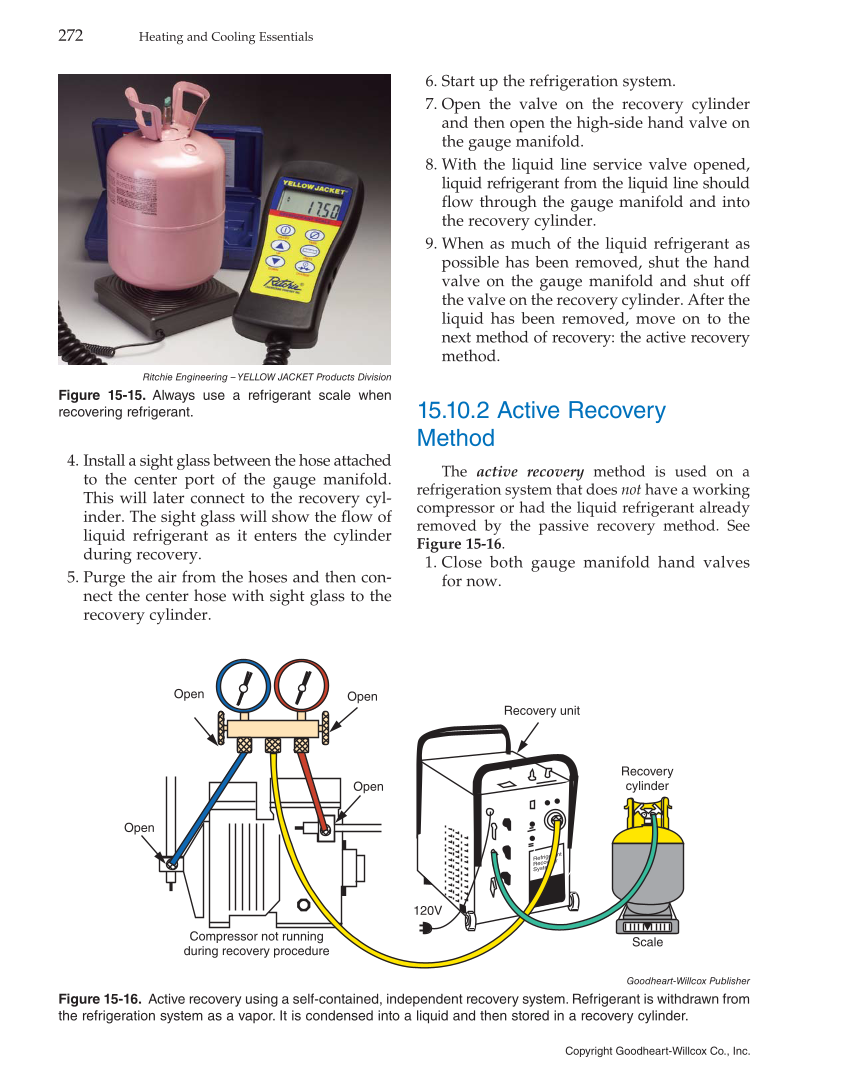 6. Start up the refrigeration system. 7. Open the valve on the recovery cylinder and then open the high-side hand valve on the gauge manifold. 8. With the liquid line service valve opened, liquid refrigerant from the liquid line should flow through the gauge manifold and into the recovery cylinder. 9. When as much of the liquid refrigerant as possible has been removed, shut the hand valve on the gauge manifold and shut off the valve on the recovery cylinder. After the liquid has been removed, move on to the next method of recovery: the active recovery method. 15.10.2 Active Recovery Method The active recovery method is used on a refrigeration system that does not have a working compressor or had the liquid refrigerant already removed by the passive recovery method. See Figure 15-16. 1. Close both gauge manifold hand valves for now. 4. Install a sight glass between the hose attached to the center port of the gauge manifold. This will later connect to the recovery cyl- inder. The sight glass will show the flow of liquid refrigerant as it enters the cylinder during recovery. 5. Purge the air from the hoses and then con- nect the center hose with sight glass to the recovery cylinder. Ritchie Engineering – YELLOW JACKET Products Division Figure 15-15. Always use a refrigerant scale when recovering refrigerant. Refrigerant Recovery System Recovery cylinder Scale 120V Recovery unit Open Open Compressor not running during recovery procedure Open Open Goodheart-Willcox Publisher Figure 15-16. Active recovery using a self-contained, independent recovery system. Refrigerant is withdrawn from the refrigeration system as a vapor. It is condensed into a liquid and then stored in a recovery cylinder. 272 Heating and Cooling Essentials Copyright Goodheart-Willcox Co., Inc.