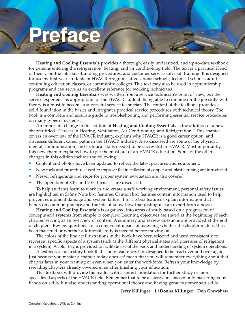 Heating and Cooling Essentials provides a thorough, easily understood, and up-to-date textbook for persons entering the refrigeration, heating, and air conditioning field. The text is a practical blend of theory, on-the-job skills-building procedures, and customer service soft-skill training. It is designed for use by first-year students in HVACR programs at vocational schools, technical schools, adult continuing education classes, or community colleges. This text may also be used in apprenticeship programs and can serve as an excellent reference for working technicians. Heating and Cooling Essentials was written from a service technician’s point of view, but the service experience is appropriate for the HVACR student. Being able to combine on-the-job skills with theory is a must to become a successful service technician. The content of the textbook provides a solid foundation in the basics and integrates practical service procedures with technical theory. The book is a complete and accurate guide to troubleshooting and performing essential service procedures on many types of systems. An important change in this edition of Heating and Cooling Essentials is the addition of a new chapter titled “Careers in Heating, Ventilation, Air Conditioning, and Refrigeration.” This chapter covers an overview of the HVACR industry, explains why HVACR is a good career option, and discusses different career paths in the HVACR industry. Also discussed are some of the physical, mental, communication, and technical skills needed to be successful in HVACR. Most importantly, this new chapter explains how to get the most out of an HVACR education. Some of the other changes in this edition include the following: • Content and photos have been updated to reflect the latest practices and equipment. • New tools and procedures used to improve the installation of copper and plastic tubing are introduced. • Newer refrigerants and steps for proper system evacuation are also covered. • The operation of 80% and 90% furnaces are discussed. To help students learn to work in and create a safe working environment, personal safety issues are highlighted in Safety Note box features. Caution box features contain information used to help prevent equipment damage and system failure. Pro Tip box features explain information that is hands-on common practice and the bits of know-how that distinguish an expert from a novice. Heating and Cooling Essentials is organized into areas of study based on a progression of concepts and systems from simple to complex. Learning objectives are stated at the beginning of each chapter, serving as an overview of content. A summary and review questions are provided at the end of chapters. Review questions are a convenient means of assessing whether the chapter material has been mastered or whether additional study is needed before moving on. The colors of the line art illustrations in the book have been selected and used consistently to represent specific aspects of a system (such as the different physical states and pressures of refrigerant in a system). A color key is provided to facilitate use of the book and understanding of system operations. A textbook is not a story book that is only read once. It is designed to be read over and over again. Just because you master a chapter today does not mean that you will remember everything about that chapter later in your training or even when you enter the workforce. Refresh your knowledge by rereading chapters already covered even after finishing your education. This textbook will provide the reader with a sound foundation for further study of more specialized aspects of the HVACR field. Remember that to be a success means not only mastering your hands-on-skills, but also understanding operational theory and having great customer soft-skills. Jerry Killinger LaDonna Killinger Don Crawshaw Preface iii Copyright Goodheart-Willcox Co., Inc.