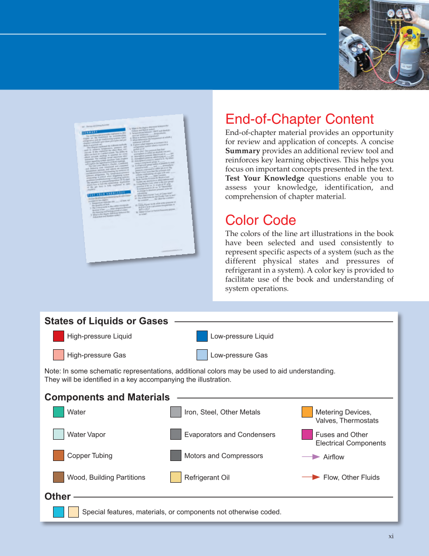 End-of-Chapter Content End-of-chapter material provides an opportunity for review and application of concepts. A concise Summary provides an additional review tool and reinforces key learning objectives. This helps you focus on important concepts presented in the text. Test Your Knowledge questions enable you to assess your knowledge, identification, and comprehension of chapter material. Color Code The colors of the line art illustrations in the book have been selected and used consistently to represent specific aspects of a system (such as the different physical states and pressures of refrigerant in a system). A color key is provided to facilitate use of the book and understanding of system operations. States of Liquids or Gases High-pressure Liquid Low-pressure Liquid High-pressure Gas Water Water Vapor Copper Tubing Wood, Building Partitions Evaporators and Condensers Fuses and Other Electrical Components Iron, Steel, Other Metals Refrigerant Oil Motors and Compressors Metering Devices, Valves, Thermostats Low-pressure Gas Components and Materials Other Flow, Other Fluids Airflow Special features, materials, or components not otherwise coded. Note: In some schematic representations, additional colors may be used to aid understanding. They will be identified in a key accompanying the illustration. xi