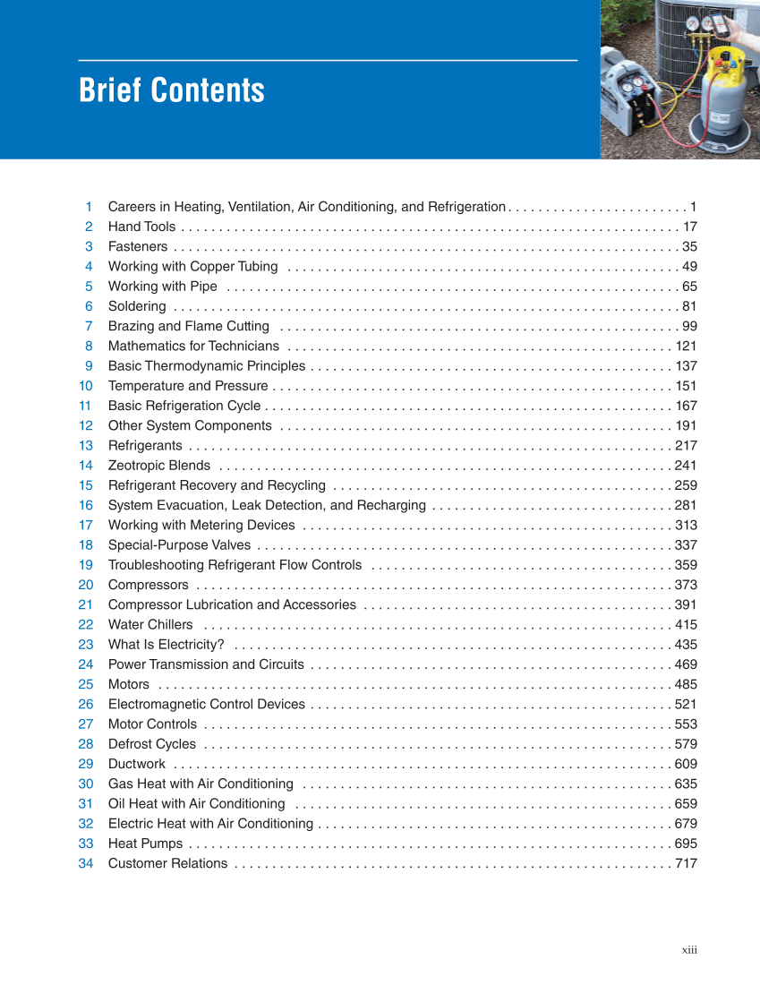 Brief Contents 1 Careers in Heating, Ventilation, Air Conditioning, and Refrigeration . . . . . . . . . . . . . . . . . . . . . . . 1 2 Hand Tools. . . . . . . . . . . . . . . . . . . . . . . . . . . . . . . . . . . . . . . . . . . . . . . . . . . . . . . . . . . . . . . . . . . 17 3 Fasteners. . . . . . . . . . . . . . . . . . . . . . . . . . . . . . . . . . . . . . . . . . . . . . . . . . . . . . . . . . . . . . . . . . . 35 4 Working with Copper Tubing . . . . . . . . . . . . . . . . . . . . . . . . . . . . . . . . . . . . . . . . . . . . . . . . . . . . 49 5 Working with Pipe . . . . . . . . . . . . . . . . . . . . . . . . . . . . . . . . . . . . . . . . . . . . . . . . . . . . . . . . . . . . 65 6 Soldering . . . . . . . . . . . . . . . . . . . . . . . . . . . . . . . . . . . . . . . . . . . . . . . . . . . . . . . . . . . . . . . . . . 81 7 Brazing and Flame Cutting . . . . . . . . . . . . . . . . . . . . . . . . . . . . . . . . . . . . . . . . . . . . . . . . . . . . . ⤀ 99 8 Mathematics for Technicians . . . . . . . . . . . . . . . . . . . . . . . . . . . . . . . . . . . . . . . . . . . . . . . . . . . . 121 9 Basic Thermodynamic Principles . . . . . . . . . . . . . . . . . . . . . . . . . . . . . . . . . . . . . . . . . . . . . . . . 137 10 Temperature and Pressure . . . . . . . . . . . . . . . . . . . . . . . . . . . . . . . . . . . . . . . . . . . . . . . . . . . . . 151 11 Basic Refrigeration Cycle . . . . . . . . . . . . . . . . . . . . . . . . . . . . . . . . . . . . . . . . . . . . . . . . . . . . . . 167 12 Other System Components . . . . . . . . . . . . . . . . . . . . . . . . . . . . . . . . . . . . . . . . . . . . . . . . . . . . . 191 13 Refrigerants . . . . . . . . . . . . . . . . . . . . . . . . . . . . . . . . . . . . . . . . . . . . . . . . . . . . . . . . . . . . . . . . 217 14 Zeotropic Blends . . . . . . . . . . . . . . . . . . . . . . . . . . . . . . . . . . . . . . . . . . . . . . . . . . . . . . . . . . . . 241 15 Refrigerant Recovery and Recycling . . . . . . . . . . . . . . . . . . . . . . . . . . . . . . . . . . . . . . . . . . . . 259 16 System Evacuation, Leak Detection, and Recharging . . . . . . . . . . . . . . . . . . . . . . . . . . . . . . . 281 17 Working with Metering Devices . . . . . . . . . . . . . . . . . . . . . . . . . . . . . . . . . . . . . . . . . . . . . . . . . 313 18 Special-Purpose Valves . . . . . . . . . . . . . . . . . . . . . . . . . . . . . . . . . . . . . . . . . . . . . . . . . . . . . . 337 19 Troubleshooting Refrigerant Flow Controls . . . . . . . . . . . . . . . . . . . . . . . . . . . . . . . . . . . . . . . . 359 20 Compressors . . . . . . . . . . . . . . . . . . . . . . . . . . . . . . . . . . . . . . . . . . . . . . . . . . . . . . . . . . . . . . 373 21 Compressor Lubrication and Accessories . . . . . . . . . . . . . . . . . . . . . . . . . . . . . . . . . . . . . . . . 391 22 Water Chillers . . . . . . . . . . . . . . . . . . . . . . . . . . . . . . . . . . . . . . . . . . . . . . . . . . . . . . . . . . . . . . . 415 23 What Is Electricity? . . . . . . . . . . . . . . . . . . . . . . . . . . . . . . . . . . . . . . . . . . . . . . . . . . . . . . . . . . 435 24 Power Transmission and Circuits . . . . . . . . . . . . . . . . . . . . . . . . . . . . . . . . . . . . . . . . . . . . . . . 469 25 Motors . . . . . . . . . . . . . . . . . . . . . . . . . . . . . . . . . . . . . . . . . . . . . . . . . . . . . . . . . . . . . . . . . . . . 485 26 Electromagnetic Control Devices . . . . . . . . . . . . . . . . . . . . . . . . . . . . . . . . . . . . . . . . . . . . . . . 521 27 Motor Controls . . . . . . . . . . . . . . . . . . . . . . . . . . . . . . . . . . . . . . . . . . . . . . . . . . . . . . . . . . . . . 553 28 Defrost Cycles . . . . . . . . . . . . . . . . . . . . . . . . . . . . . . . . . . . . . . . . . . . . . . . . . . . . . . . . . . . . . . 579 29 Ductwork . . . . . . . . . . . . . . . . . . . . . . . . . . . . . . . . . . . . . . . . . . . . . . . . . . . . . . . . . . . . . . . . . . 609 30 Gas Heat with Air Conditioning . . . . . . . . . . . . . . . . . . . . . . . . . . . . . . . . . . . . . . . . . . . . . . . . . 635 31 Oil Heat with Air Conditioning . . . . . . . . . . . . . . . . . . . . . . . . . . . . . . . . . . . . . . . . . . . . . . . . . . 659 32 Electric Heat with Air Conditioning . . . . . . . . . . . . . . . . . . . . . . . . . . . . . . . . . . . . . . . . . . . . . . 679 33 Heat Pumps . . . . . . . . . . . . . . . . . . . . . . . . . . . . . . . . . . . . . . . . . . . . . . . . . . . . . . . . . . . . . . . 695 34 Customer Relations . . . . . . . . . . . . . . . . . . . . . . . . . . . . . . . . . . . . . . . . . . . . . . . . . . . . . . . . . . 717 xiii