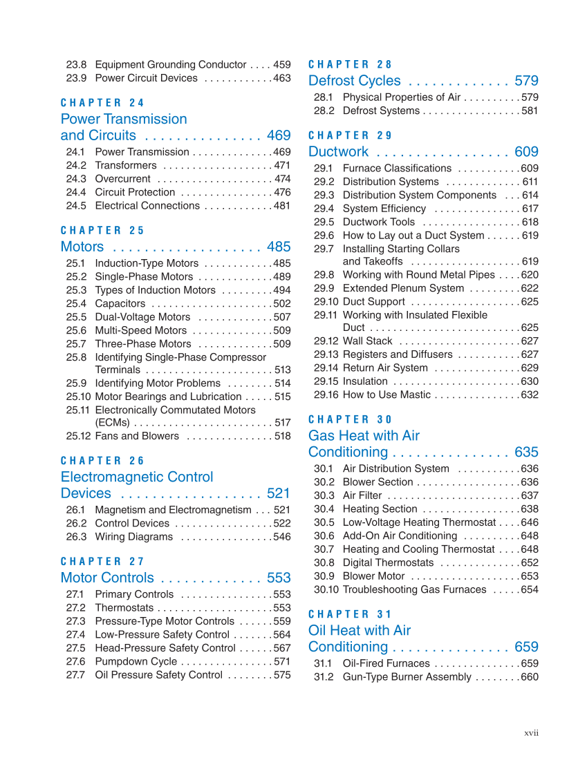 23.8 Equipment Grounding Conductor . . . . 459 23.9 Power Circuit Devices . . . . . . . . . . . . 463 C H A P T E R 2 4 Power Transmission and Circuits . . . . . . . . . . . . . . . . 469 24.1 Power Transmission . . . . . . . . . . . . . 469 24.2 Transformers . . . . . . . . . . . . . . . . . . . 471 24.3 Overcurrent . . . . . . . . . . . . . . . . . . . . 474 24.4 Circuit Protection . . . . . . . . . . . . . . . 476 24.5 Electrical Connections . . . . . . . . . . . 481 C H A P T E R 2 5 Motors . . . . . . . . . . . . . . . . . . . . 485 25.1 Induction-Type Motors . . . . . . . . . . . 485 25.2 Single-Phase Motors . . . . . . . . . . . . 489 25.3 Types of Induction Motors . . . . . . . . . 494 25.4 Capacitors . . . . . . . . . . . . . . . . . . . . . 502 25.5 Dual-Voltage Motors . . . . . . . . . . . . . 507 25.6 Multi-Speed Motors . . . . . . . . . . . . . 509 25.7 Three-Phase Motors . . . . . . . . . . . . . 509 25.8 Identifying Single-Phase Compressor Terminals . . . . . . . . . . . . . . . . . . . . . 513 25.9 Identifying Motor Problems . . . . . . . . 514 25.10 Motor Bearings and Lubrication . . . . 515 25.11 Electronically Commutated Motors (ECMs). . . . . . . . . . . . . . . . . . . . . . . . 517 25.12 Fans and Blowers . . . . . . . . . . . . . . . 518 C H A P T E R 2 6 Electromagnetic Control Devices . . . . . . . . . . . . . . . . . . . 521 26.1 Magnetism and Electromagnetism . . . 521 26.2 Control Devices . . . . . . . . . . . . . . . . 522 26.3 Wiring Diagrams . . . . . . . . . . . . . . . . 546 C H A P T E R 2 7 Motor Controls . . . . . . . . . . . . . 553 27.1 Primary Controls . . . . . . . . . . . . . . . . 553 27.2 Thermostats . . . . . . . . . . . . . . . . . . . 553 27.3 Pressure-Type Motor Controls . . . . . 559 27.4 Low-Pressure Safety Control . . . . . . 564 27.5 Head-Pressure Safety Control . . . . . 567 27.6 Pumpdown Cycle . . . . . . . . . . . . . . . 571 27.7 Oil Pressure Safety Control . . . . . . . 575 C H A P T E R 2 8 Defrost Cycles . . . . . . . . . . . . . 579 28.1 Physical Properties of Air . . . . . . . . . 579 28.2 Defrost Systems . . . . . . . . . . . . . . . . 581 C H A P T E R 2 9 Ductwork . . . . . . . . . . . . . . . . . 609 29.1 Furnace Classifications . . . . . . . . . . . 609 29.2 Distribution Systems . . . . . . . . . . . . . . 611 29.3 Distribution System Components . . . 614 29.4 System Efficiency . . . . . . . . . . . . . . . 617 29.5 Ductwork Tools . . . . . . . . . . . . . . . . . ⤀ 618 29.6 How to Lay out a Duct System . . . . . 619 29.7 Installing Starting Collars and Takeoffs . . . . . . . . . . . . . . . . . . . 619 29.8 Working with Round Metal Pipes . . . 620 29.9 Extended Plenum System . . . . . . . . 622 29.10 Duct Support . . . . . . . . . . . . . . . . . . . 625 29.11 Working with Insulated Flexible Duct . . . . . . . . . . . . . . . . . . . . . . . . . 625 29.12 Wall Stack . . . . . . . . . . . . . . . . . . . . . 627 29.13 Registers and Diffusers . . . . . . . . . . 627 29.14 Return Air System . . . . . . . . . . . . . . . 629 29.15 Insulation . . . . . . . . . . . . . . . . . . . . . 630 29.16 How to Use Mastic . . . . . . . . . . . . . . 632 C H A P T E R 3 0 Gas Heat with Air Conditioning . . . . . . . . . . . . . . . 635 30.1 Air Distribution System . . . . . . . . . . . 636 30.2 Blower Section . . . . . . . . . . . . . . . . . ⤀ 636 30.3 Air Filter . . . . . . . . . . . . . . . . . . . . . . 637 30.4 Heating Section . . . . . . . . . . . . . . . . 638 30.5 Low-Voltage Heating Thermostat . . . 646 30.6 Add-On Air Conditioning . . . . . . . . . . 648 30.7 Heating and Cooling Thermostat . . . 648 30.8 Digital Thermostats . . . . . . . . . . . . . . 652 30.9 Blower Motor . . . . . . . . . . . . . . . . . . . 653 30.10 Troubleshooting Gas Furnaces . . . . . 654 C H A P T E R 3 1 Oil Heat with Air Conditioning . . . . . . . . . . . . . . . 659 31.1 Oil-Fired Furnaces . . . . . . . . . . . . . . 659 31.2 Gun-Type Burner Assembly . . . . . . . 660 xvii