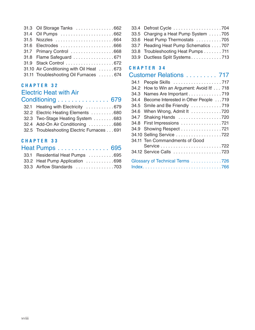 31.3 Oil Storage Tanks . . . . . . . . . . . . . . . 662 31.4 Oil Pumps . . . . . . . . . . . . . . . . . . . . . 662 31.5 Nozzles . . . . . . . . . . . . . . . . . . . . . . . 664 31.6 Electrodes . . . . . . . . . . . . . . . . . . . . . 666 31.7 Primary Control . . . . . . . . . . . . . . . . . ⤀ 668 31.8 Flame Safeguard . . . . . . . . . . . . . . . 671 31.9 Stack Control . . . . . . . . . . . . . . . . . . 672 31.10 Air Conditioning with Oil Heat . . . . . . 673 31.11 Troubleshooting Oil Furnaces . . . . . . 674 C H A P T E R 3 2 Electric Heat with Air Conditioning . . . . . . . . . . . . . . . 679 32.1 Heating with Electricity . . . . . . . . . . . 679 32.2 Electric Heating Elements . . . . . . . . . 680 32.3 Two-Stage Heating System . . . . . . . 683 32.4 Add-On Air Conditioning . . . . . . . . . . 686 32.5 Troubleshooting Electric Furnaces . . 691 C H A P T E R 3 3 Heat Pumps . . . . . . . . . . . . . . . 695 33.1 Residential Heat Pumps . . . . . . . . . . 695 33.2 Heat Pump Application . . . . . . . . . . . 698 33.3 Airflow Standards . . . . . . . . . . . . . . . 703 33.4 Defrost Cycle . . . . . . . . . . . . . . . . . . 704 33.5 Charging a Heat Pump System . . . . 705 33.6 Heat Pump Thermostats . . . . . . . . . . 705 33.7 Reading Heat Pump Schematics . . . 707 33.8 Troubleshooting Heat Pumps . . . . . . . 711 33.9 Ductless Split Systems . . . . . . . . . . . 713 C H A P T E R 3 4 Customer Relations . . . . . . . . . 717 34.1 People Skills . . . . . . . . . . . . . . . . . . . 717 34.2 How to Win an Argument: Avoid It! . . . 718 34.3 Names Are Important . . . . . . . . . . . . 719 34.4 Become Interested in Other People . . . 719 34.5 Smile and Be Friendly . . . . . . . . . . . . 719 34.6 When Wrong, Admit It . . . . . . . . . . . . 720 34.7 Shaking Hands . . . . . . . . . . . . . . . . . ⤀ 720 34.8 First Impressions . . . . . . . . . . . . . . . 721 34.9 Showing Respect . . . . . . . . . . . . . . . 721 34.10 Selling Service . . . . . . . . . . . . . . . . . ⤀ 722 34.11 Ten Commandments of Good Service . . . . . . . . . . . . . . . . . . . . . . . 722 34.12 Service Calls . . . . . . . . . . . . . . . . . . . 723 Glossary of Technical Terms. . . . . . . . . . . . 726 Index. . . . . . . . . . . . . . . . . . . . . . . . . . . . . . 766 xviii