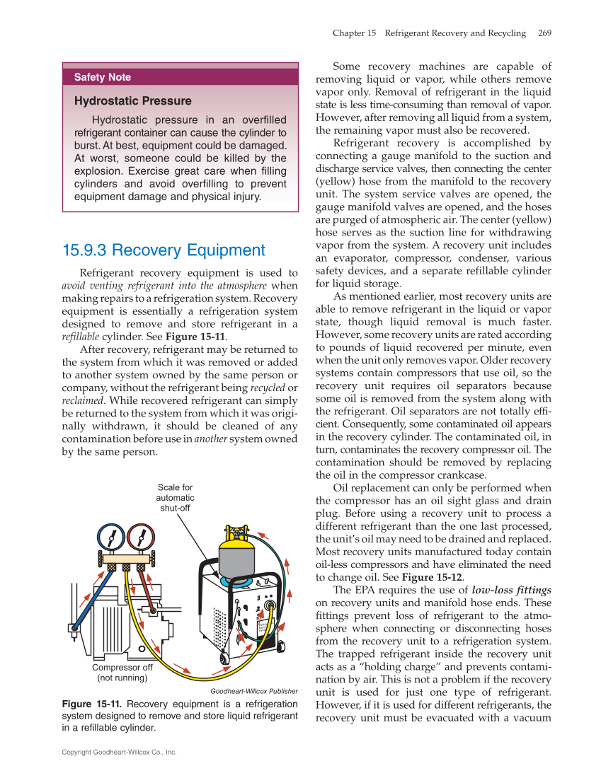 Some recovery machines are capable of removing liquid or vapor, while others remove vapor only. Removal of refrigerant in the liquid state is less time-consuming than removal of vapor. However, after removing all liquid from a system, the remaining vapor must also be recovered. Refrigerant recovery is accomplished by connecting a gauge manifold to the suction and discharge service valves, then connecting the center (yellow) hose from the manifold to the recovery unit. The system service valves are opened, the gauge manifold valves are opened, and the hoses are purged of atmospheric air. The center (yellow) hose serves as the suction line for withdrawing vapor from the system. A recovery unit includes an evaporator, compressor, condenser, various safety devices, and a separate refillable cylinder for liquid storage. As mentioned earlier, most recovery units are able to remove refrigerant in the liquid or vapor state, though liquid removal is much faster. However, some recovery units are rated according to pounds of liquid recovered per minute, even when the unit only removes vapor. Older recovery systems contain compressors that use oil, so the recovery unit requires oil separators because some oil is removed from the system along with the refrigerant. Oil separators are not totally effi- cient. Consequently, some contaminated oil appears in the recovery cylinder. The contaminated oil, in turn, contaminates the recovery compressor oil. The contamination should be removed by replacing the oil in the compressor crankcase. Oil replacement can only be performed when the compressor has an oil sight glass and drain plug. Before using a recovery unit to process a different refrigerant than the one last processed, the unit’s oil may need to be drained and replaced. Most recovery units manufactured today contain oil-less compressors and have eliminated the need to change oil. See Figure 15‑12. The EPA requires the use of low-loss fittings on recovery units and manifold hose ends. These fittings prevent loss of refrigerant to the atmo- sphere when connecting or disconnecting hoses from the recovery unit to a refrigeration system. The trapped refrigerant inside the recovery unit acts as a “holding charge” and prevents contami- nation by air. This is not a problem if the recovery unit is used for just one type of refrigerant. However, if it is used for different refrigerants, the recovery unit must be evacuated with a vacuum Safety Note Hydrostatic Pressure Hydrostatic pressure in an overfilled refrigerant container can cause the cylinder to burst. At best, equipment could be damaged. At worst, someone could be killed by the explosion. Exercise great care when filling cylinders and avoid overfilling to prevent equipment damage and physical injury. 15.9.3 Recovery Equipment Refrigerant recovery equipment is used to avoid venting refrigerant into the atmosphere when making repairs to a refrigeration system. Recovery equipment is essentially a refrigeration system designed to remove and store refrigerant in a refillable cylinder. See Figure 15‑11. After recovery, refrigerant may be returned to the system from which it was removed or added to another system owned by the same person or company, without the refrigerant being recycled or reclaimed. While recovered refrigerant can simply be returned to the system from which it was origi- nally withdrawn, it should be cleaned of any contamination before use in another system owned by the same person. Refrigerant Recovery System Compressor off (not running) Scale for automatic shut-off Goodheart-Willcox Publisher Figure 15‑11. Recovery equipment is a refrigeration system designed to remove and store liquid refrigerant in a refillable cylinder. Chapter 15 Refrigerant Recovery and Recycling 269 Copyright Goodheart-Willcox Co., Inc.