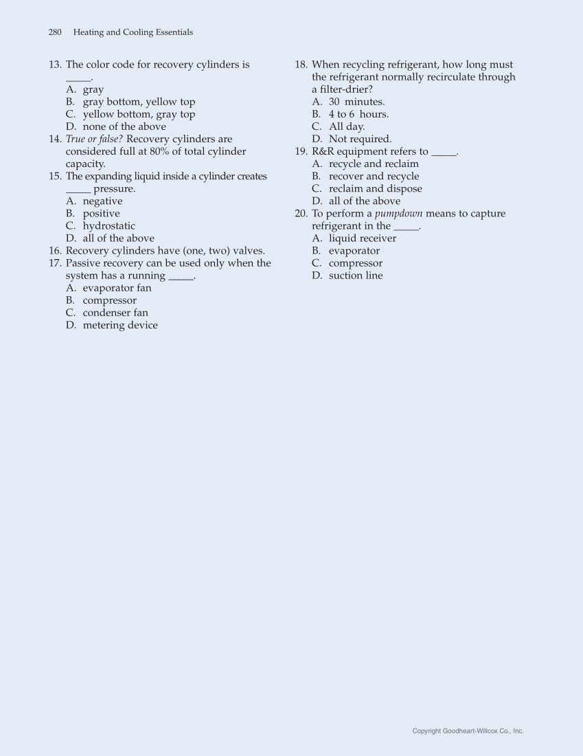 13. The color code for recovery cylinders is _____. A. gray B. gray bottom, yellow top C. yellow bottom, gray top D. none of the above 14. True or false? Recovery cylinders are considered full at 80% of total cylinder capacity. 15. The expanding liquid inside a cylinder creates _____ pressure. A. negative B. positive C. hydrostatic D. all of the above 16. Recovery cylinders have (one, two) valves. 17. Passive recovery can be used only when the system has a running _____. A. evaporator fan B. compressor C. condenser fan D. metering device 18. When recycling refrigerant, how long must the refrigerant normally recirculate through a filter-drier? A. 30 minutes. B. 4 to 6 hours. C. All day. D. Not required. 19. R&R equipment refers to _____. A. recycle and reclaim B. recover and recycle C. reclaim and dispose D. all of the above 20. To perform a pumpdown means to capture refrigerant in the _____. A. liquid receiver B. evaporator C. compressor D. suction line 280 Heating and Cooling Essentials Copyright Goodheart-Willcox Co., Inc.