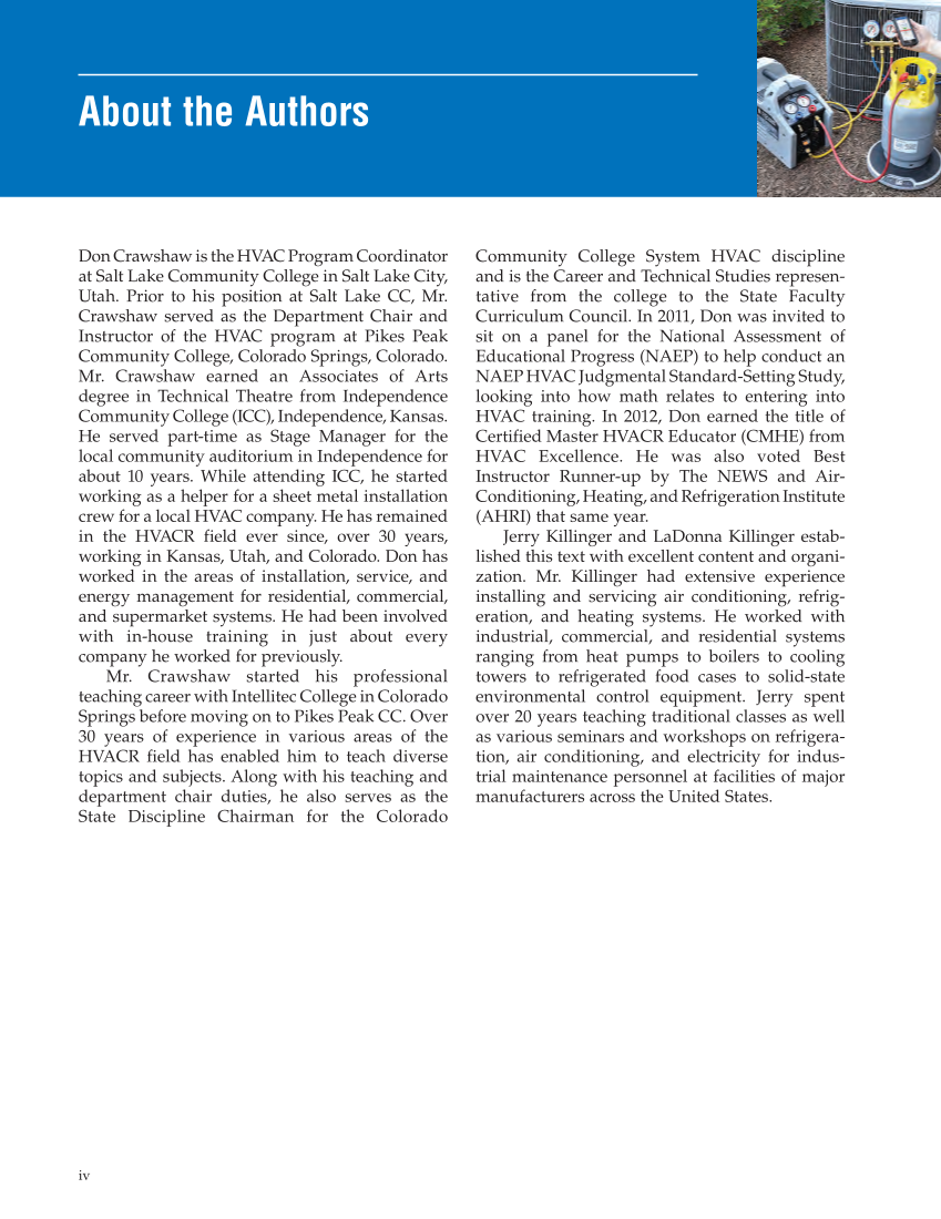 About the Authors Don Crawshaw is the HVAC Program Coordinator at Salt Lake Community College in Salt Lake City, Utah. Prior to his position at Salt Lake CC, Mr. Crawshaw served as the Department Chair and Instructor of the HVAC program at Pikes Peak Community College, Colorado Springs, Colorado. Mr. Crawshaw earned an Associates of Arts degree in Technical Theatre from Independence Community College (ICC), Independence, Kansas. He served part-time as Stage Manager for the local community auditorium in Independence for about 10 years. While attending ICC, he started working as a helper for a sheet metal installation crew for a local HVAC company. He has remained in the HVACR field ever since, over 30 years, working in Kansas, Utah, and Colorado. Don has worked in the areas of installation, service, and energy management for residential, commercial, and supermarket systems. He had been involved with in-house training in just about every company he worked for previously. Mr. Crawshaw started his professional teaching career with Intellitec College in Colorado Springs before moving on to Pikes Peak CC. Over 30 years of experience in various areas of the HVACR field has enabled him to teach diverse topics and subjects. Along with his teaching and department chair duties, he also serves as the State Discipline Chairman for the Colorado Community College System HVAC discipline and is the Career and Technical Studies represen- tative from the college to the State Faculty Curriculum Council. In 2011, Don was invited to sit on a panel for the National Assessment of Educational Progress (NAEP) to help conduct an NAEP HVAC Judgmental Standard-Setting Study, looking into how math relates to entering into HVAC training. In 2012, Don earned the title of Certified Master HVACR Educator (CMHE) from HVAC Excellence. He was also voted Best Instructor Runner-up by The NEWS and Air- Conditioning, Heating, and Refrigeration Institute (AHRI) that same year. Jerry Killinger and LaDonna Killinger estab- lished this text with excellent content and organi- zation. Mr. Killinger had extensive experience installing and servicing air conditioning, refrig- eration, and heating systems. He worked with industrial, commercial, and residential systems ranging from heat pumps to boilers to cooling towers to refrigerated food cases to solid-state environmental control equipment. Jerry spent over 20 years teaching traditional classes as well as various seminars and workshops on refrigera- tion, air conditioning, and electricity for indus- trial maintenance personnel at facilities of major manufacturers across the United States. iv