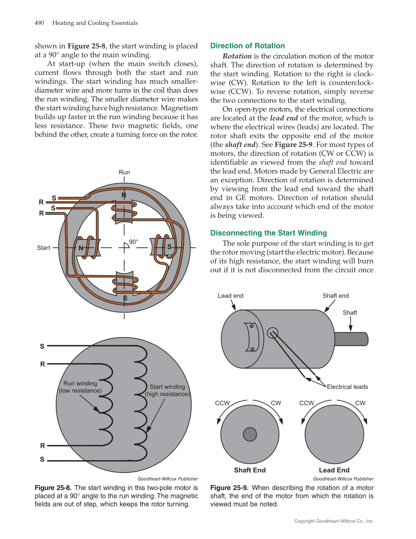 Direction of Rotation Rotation is the circulation motion of the motor shaft. The direction of rotation is determined by the start winding. Rotation to the right is clock- wise (CW). Rotation to the left is counterclock- wise (CCW). To reverse rotation, simply reverse the two connections to the start winding. On open-type motors, the electrical connections are located at the lead end of the motor, which is where the electrical wires (leads) are located. The rotor shaft exits the opposite end of the motor (the shaft end). See Figure 25‑9. For most types of motors, the direction of rotation (CW or CCW) is identifiable as viewed from the shaft end toward the lead end. Motors made by General Electric are an exception. Direction of rotation is determined by viewing from the lead end toward the shaft end in GE motors. Direction of rotation should always take into account which end of the motor is being viewed. Disconnecting the Start Winding The sole purpose of the start winding is to get the rotor moving (start the electric motor). Because of its high resistance, the start winding will burn out if it is not disconnected from the circuit once shown in Figure 25‑8, the start winding is placed at a 90° angle to the main winding. At start-up (when the main switch closes), current flows through both the start and run windings. The start winding has much smaller- diameter wire and more turns in the coil than does the run winding. The smaller diameter wire makes the start winding have high resistance. Magnetism builds up faster in the run winding because it has less resistance. These two magnetic fields, one behind the other, create a turning force on the rotor. S R S R N N S S S S R R Run winding (low resistance) Start winding (high resistance) Start Run 90° Goodheart-Willcox Publisher Figure 25‑8. The start winding in this two-pole motor is placed at a 90° angle to the run winding. The magnetic fields are out of step, which keeps the rotor turning. Electrical leads Shaft end Shaft Lead end Shaft End Lead End CCW CW CCW CW Goodheart-Willcox Publisher Figure 25‑9. When describing the rotation of a motor shaft, the end of the motor from which the rotation is viewed must be noted. 490 Heating and Cooling Essentials Copyright Goodheart-Willcox Co., Inc.