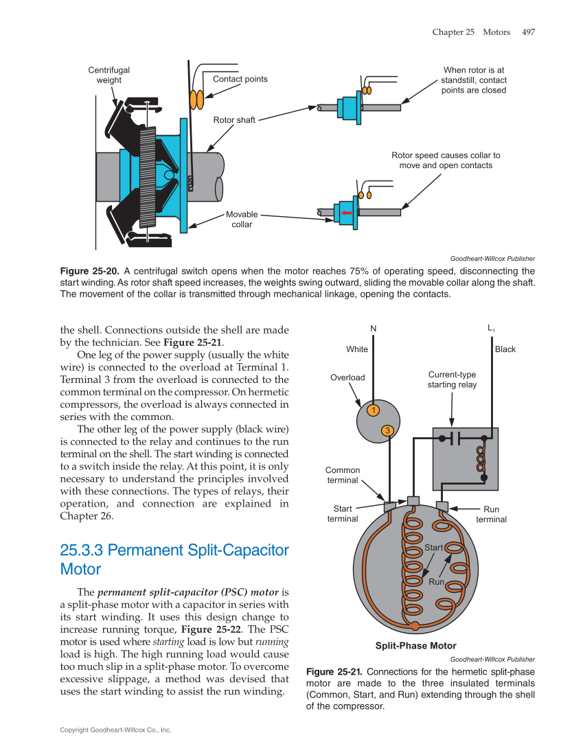 the shell. Connections outside the shell are made by the technician. See Figure 25‑21. One leg of the power supply (usually the white wire) is connected to the overload at Terminal 1. Terminal 3 from the overload is connected to the common terminal on the compressor. On hermetic compressors, the overload is always connected in series with the common. The other leg of the power supply (black wire) is connected to the relay and continues to the run terminal on the shell. The start winding is connected to a switch inside the relay. At this point, it is only necessary to understand the principles involved with these connections. The types of relays, their operation, and connection are explained in Chapter 26. 25.3.3 Permanent Split-Capacitor Motor The permanent split-capacitor (PSC) motor is a split-phase motor with a capacitor in series with its start winding. It uses this design change to increase running torque, Figure 25‑22. The PSC motor is used where starting load is low but running load is high. The high running load would cause too much slip in a split-phase motor. To overcome excessive slippage, a method was devised that uses the start winding to assist the run winding. Centrifugal weight Contact points Rotor shaft Movable collar Rotor speed causes collar to move and open contacts When rotor is at standstill, contact points are closed Goodheart-Willcox Publisher Figure 25‑20. A centrifugal switch opens when the motor reaches 75% of operating speed, disconnecting the start winding. As rotor shaft speed increases, the weights swing outward, sliding the movable collar along the shaft. The movement of the collar is transmitted through mechanical linkage, opening the contacts. 1 3 Start Run N L1 Black White Overload Current-type starting relay Run terminal Start terminal Common terminal Split-Phase Motor Goodheart-Willcox Publisher Figure 25‑21. Connections for the hermetic split-phase motor are made to the three insulated terminals (Common, Start, and Run) extending through the shell of the compressor. Chapter 25 Motors 497 Copyright Goodheart-Willcox Co., Inc.