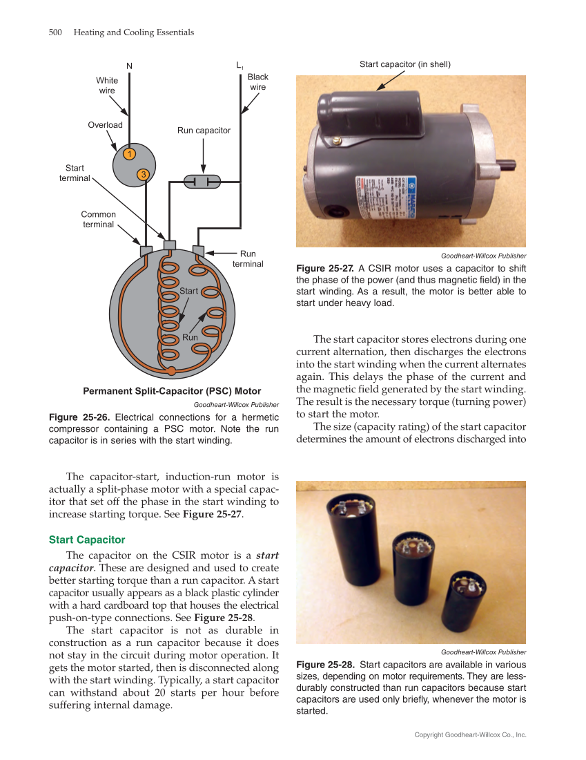 The start capacitor stores electrons during one current alternation, then discharges the electrons into the start winding when the current alternates again. This delays the phase of the current and the magnetic field generated by the start winding. The result is the necessary torque (turning power) to start the motor. The size (capacity rating) of the start capacitor determines the amount of electrons discharged into The capacitor-start, induction-run motor is actually a split-phase motor with a special capac- itor that set off the phase in the start winding to increase starting torque. See Figure 25‑27. Start Capacitor The capacitor on the CSIR motor is a start capacitor. These are designed and used to create better starting torque than a run capacitor. A start capacitor usually appears as a black plastic cylinder with a hard cardboard top that houses the electrical push-on-type connections. See Figure 25‑28. The start capacitor is not as durable in construction as a run capacitor because it does not stay in the circuit during motor operation. It gets the motor started, then is disconnected along with the start winding. Typically, a start capacitor can withstand about 20 starts per hour before suffering internal damage. 1 3 Start Run N L1 Black wire White wire Overload Run terminal Start terminal Common terminal Run capacitor Permanent Split-Capacitor (PSC) Motor Goodheart-Willcox Publisher Figure 25‑26. Electrical connections for a hermetic compressor containing a PSC motor. Note the run capacitor is in series with the start winding. Start capacitor (in shell) Goodheart-Willcox Publisher Figure 25‑27. A CSIR motor uses a capacitor to shift the phase of the power (and thus magnetic field) in the start winding. As a result, the motor is better able to start under heavy load. Goodheart-Willcox Publisher Figure 25‑28. Start capacitors are available in various sizes, depending on motor requirements. They are less- durably constructed than run capacitors because start capacitors are used only briefly, whenever the motor is started. 500 Heating and Cooling Essentials Copyright Goodheart-Willcox Co., Inc.