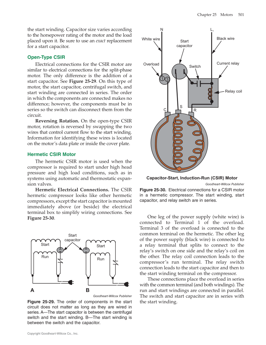 One leg of the power supply (white wire) is connected to Terminal 1 of the overload. Terminal 3 of the overload is connected to the common terminal on the hermetic. The other leg of the power supply (black wire) is connected to a relay terminal that splits to connect to the relay’s switch on one side and the relay’s coil on the other. The relay coil connection leads to the compressor’s run terminal. The relay switch connection leads to the start capacitor and then to the start winding terminal on the compressor. These connections place the overload in series with the common terminal (and both windings). The run and start windings are connected in parallel. The switch and start capacitor are in series with the start winding. the start winding. Capacitor size varies according to the horsepower rating of the motor and the load placed upon it. Be sure to use an exact replacement for a start capacitor. Open-Type CSIR Electrical connections for the CSIR motor are similar to electrical connections for the split-phase motor. The only difference is the addition of a start capacitor. See Figure 25‑29. On this type of motor, the start capacitor, centrifugal switch, and start winding are connected in series. The order in which the components are connected makes no difference however, the components must be in series so the switch can disconnect them from the circuit. Reversing Rotation. On the open-type CSIR motor, rotation is reversed by swapping the two wires that control current flow to the start winding. Information for identifying these wires is located on the motor’s data plate or inside the cover plate. Hermetic CSIR Motor The hermetic CSIR motor is used when the compressor is required to start under high head pressure and high load conditions, such as in systems using automatic and thermostatic expan- sion valves. Hermetic Electrical Connections. The CSIR hermetic compressor looks like other hermetic compressors, except the start capacitor is mounted immediately above (or beside) the electrical terminal box to simplify wiring connections. See Figure 25‑30. Start Run Start Run Start capacitor A B Goodheart-Willcox Publisher Figure 25‑29. The order of components in the start circuit does not matter as long as they are wired in series. A—The start capacitor is between the centrifugal switch and the start winding. B—The start winding is between the switch and the capacitor. N L1 Black wire White wire Overload Current relay Start capacitor Switch Relay coil C S R Capacitor-Start, Induction-Run (CSIR) Motor 1 3 Goodheart-Willcox Publisher Figure 25‑30. Electrical connections for a CSIR motor in a hermetic compressor. The start winding, start capacitor, and relay switch are in series. Chapter 25 Motors 501 Copyright Goodheart-Willcox Co., Inc.