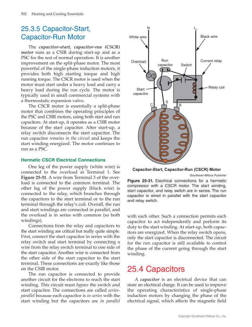with each other. Such a connection permits each capacitor to act independently and perform its duty to the start winding. At start-up, both capac- itors are energized. When the relay switch opens, only the start capacitor is disconnected. The circuit for the run capacitor is still available to control the phase of the current going through the start winding. 25.4 Capacitors A capacitor is an electrical device that can store an electrical charge. It can be used to improve the operating characteristics of single-phase induction motors by changing the phase of the electrical signal, which affects the magnetic field 25.3.5 Capacitor-Start, Capacitor-Run Motor The capacitor-start, capacitor-run (CSCR) motor runs as a CSIR during start-up and as a PSC for the rest of normal operation. It is another improvement on the split-phase motor. The most powerful of the single-phase induction motors, it provides both high starting torque and high running torque. The CSCR motor is used when the motor must start under a heavy load and carry a heavy load during the run cycle. The motor is typically used in small commercial systems with a thermostatic expansion valve. The CSCR motor is essentially a split-phase motor that combines the operating principles of the PSC and CSIR motors, using both start and run capacitors. At start-up, it operates as a CSIR motor because of the start capacitor. After start-up, a relay switch disconnects the start capacitor. The run capacitor remains in the circuit and keeps the start winding energized. The motor continues to run as a PSC. Hermetic CSCR Electrical Connections One leg of the power supply (white wire) is connected to the overload at Terminal 1. See Figure 25‑31. A wire from Terminal 3 of the over- load is connected to the common terminal. The other leg of the power supply (black wire) is connected to the relay, which branches through the capacitors to the start terminal or to the run terminal through the relay’s coil. Overall, the run and start windings are connected in parallel, and the overload is in series with common (so both windings). Connections from the relay and capacitors to the start winding are critical but really quite simple. First, connect the start capacitor in series with the relay switch and start terminal by connecting a wire from the relay switch terminal to one side of the start capacitor. Another wire is connected from the other side of the start capacitor to the start terminal. These connections are exactly like those on the CSIR motor. The run capacitor is connected to provide another circuit for the electrons to reach the start winding. This circuit must bypass the switch and start capacitor. The connections are called series- parallel because each capacitor is in series with the start winding but the capacitors are in parallel N L1 Black wire White wire Overload Relay coil C S R Run capacitor Start capacitor Switch Current relay 1 3 Capacitor-Start, Capacitor-Run (CSCR) Motor Goodheart-Willcox Publisher Figure 25‑31. Electrical connections for a hermetic compressor with a CSCR motor. The start winding, start capacitor, and relay switch are in series. The run capacitor is wired in parallel with the start capacitor and relay switch. 502 Heating and Cooling Essentials Copyright Goodheart-Willcox Co., Inc.