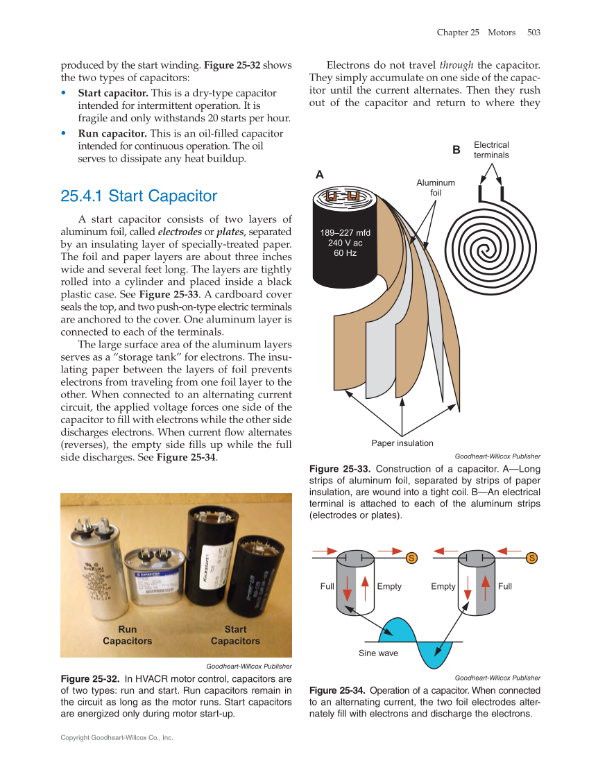Electrons do not travel through the capacitor. They simply accumulate on one side of the capac- itor until the current alternates. Then they rush out of the capacitor and return to where they produced by the start winding. Figure 25‑32 shows the two types of capacitors: • • Start capacitor. This is a dry-type capacitor intended for intermittent operation. It is fragile and only withstands 20 starts per hour. • • Run capacitor. This is an oil-filled capacitor intended for continuous operation. The oil serves to dissipate any heat buildup. 25.4.1 Start Capacitor A start capacitor consists of two layers of aluminum foil, called electrodes or plates, separated by an insulating layer of specially-treated paper. The foil and paper layers are about three inches wide and several feet long. The layers are tightly rolled into a cylinder and placed inside a black plastic case. See Figure 25‑33. A cardboard cover seals the top, and two push-on-type electric terminals are anchored to the cover. One aluminum layer is connected to each of the terminals. The large surface area of the aluminum layers serves as a “storage tank” for electrons. The insu- lating paper between the layers of foil prevents electrons from traveling from one foil layer to the other. When connected to an alternating current circuit, the applied voltage forces one side of the capacitor to fill with electrons while the other side discharges electrons. When current flow alternates (reverses), the empty side fills up while the full side discharges. See Figure 25‑34. Run Capacitors Start Capacitors Goodheart-Willcox Publisher Figure 25‑32. In HVACR motor control, capacitors are of two types: run and start. Run capacitors remain in the circuit as long as the motor runs. Start capacitors are energized only during motor start-up. Paper insulation Aluminum foil 189–227 mfd 240 V ac 60 Hz Electrical terminals A B Goodheart-Willcox Publisher Figure 25‑33. Construction of a capacitor. A—Long strips of aluminum foil, separated by strips of paper insulation, are wound into a tight coil. B—An electrical terminal is attached to each of the aluminum strips (electrodes or plates). S S Empty Empty Full Full Sine wave Goodheart-Willcox Publisher Figure 25‑34. Operation of a capacitor. When connected to an alternating current, the two foil electrodes alter- nately fill with electrons and discharge the electrons. Chapter 25 Motors 503 Copyright Goodheart-Willcox Co., Inc.