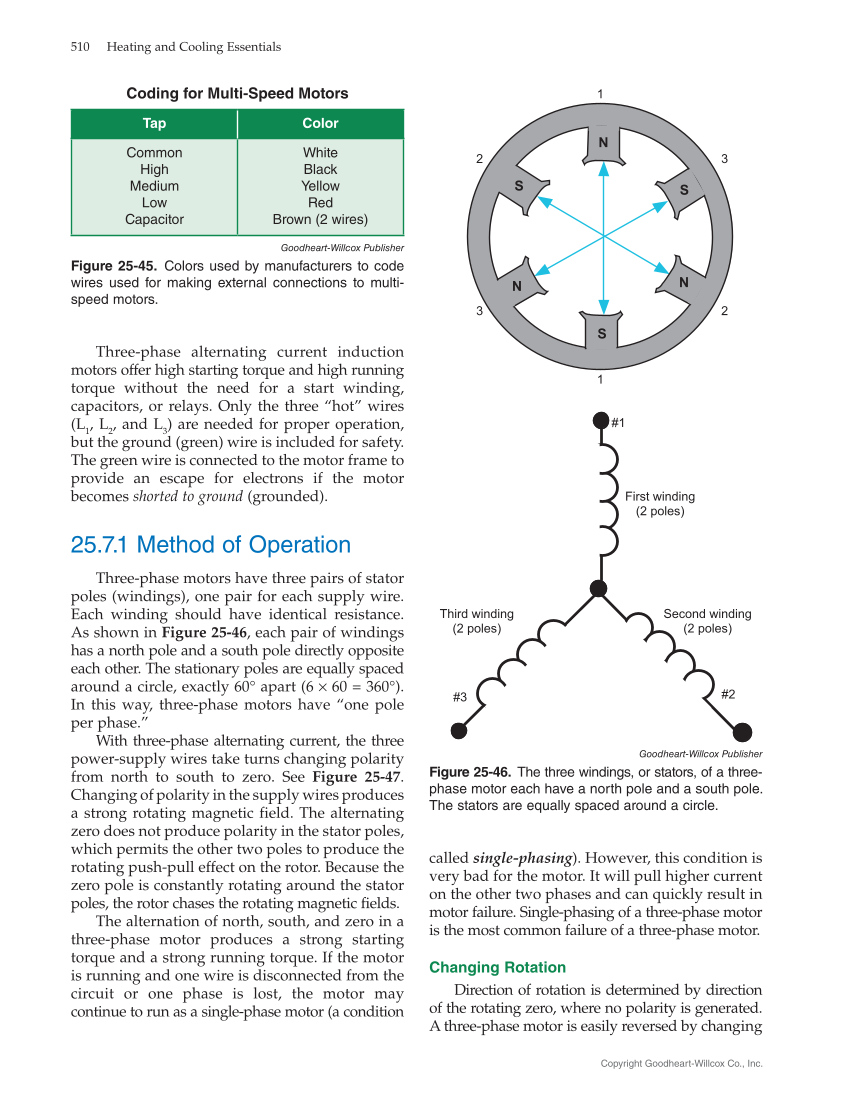 called single-phasing). However, this condition is very bad for the motor. It will pull higher current on the other two phases and can quickly result in motor failure. Single-phasing of a three-phase motor is the most common failure of a three-phase motor. Changing Rotation Direction of rotation is determined by direction of the rotating zero, where no polarity is generated. A three-phase motor is easily reversed by changing Three-phase alternating current induction motors offer high starting torque and high running torque without the need for a start winding, capacitors, or relays. Only the three “hot” wires (L 1 , L 2 , and L 3 ) are needed for proper operation, but the ground (green) wire is included for safety. The green wire is connected to the motor frame to provide an escape for electrons if the motor becomes shorted to ground (grounded). 25.7.1 Method of Operation Three-phase motors have three pairs of stator poles (windings), one pair for each supply wire. Each winding should have identical resistance. As shown in Figure 25‑46, each pair of windings has a north pole and a south pole directly opposite each other. The stationary poles are equally spaced around a circle, exactly 60° apart (6 × 60 = 360°). In this way, three-phase motors have “one pole per phase.” With three-phase alternating current, the three power-supply wires take turns changing polarity from north to south to zero. See Figure 25‑47. Changing of polarity in the supply wires produces a strong rotating magnetic field. The alternating zero does not produce polarity in the stator poles, which permits the other two poles to produce the rotating push-pull effect on the rotor. Because the zero pole is constantly rotating around the stator poles, the rotor chases the rotating magnetic fields. The alternation of north, south, and zero in a three-phase motor produces a strong starting torque and a strong running torque. If the motor is running and one wire is disconnected from the circuit or one phase is lost, the motor may continue to run as a single-phase motor (a condition Goodheart-Willcox Publisher Figure 25‑45. Colors used by manufacturers to code wires used for making external connections to multi- speed motors. Coding for Multi-Speed Motors Tap Color Common High Medium Low Capacitor White Black Yellow Red Brown (2 wires) N N N S S S #1 First winding (2 poles) Second winding (2 poles) Third winding (2 poles) #2 #3 1 2 3 1 2 3 Goodheart-Willcox Publisher Figure 25‑46. The three windings, or stators, of a three- phase motor each have a north pole and a south pole. The stators are equally spaced around a circle. 510 Heating and Cooling Essentials Copyright Goodheart-Willcox Co., Inc.