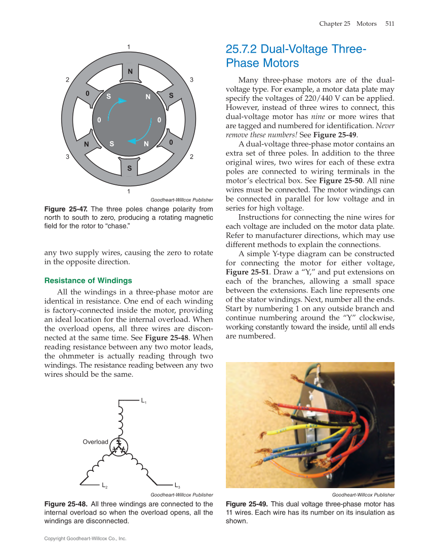 25.7.2 Dual-Voltage Three- Phase Motors Many three-phase motors are of the dual- voltage type. For example, a motor data plate may specify the voltages of 220/440 V can be applied. However, instead of three wires to connect, this dual-voltage motor has nine or more wires that are tagged and numbered for identification. Never remove these numbers! See Figure 25‑49. A dual-voltage three-phase motor contains an extra set of three poles. In addition to the three original wires, two wires for each of these extra poles are connected to wiring terminals in the motor’s electrical box. See Figure 25‑50. All nine wires must be connected. The motor windings can be connected in parallel for low voltage and in series for high voltage. Instructions for connecting the nine wires for each voltage are included on the motor data plate. Refer to manufacturer directions, which may use different methods to explain the connections. A simple Y-type diagram can be constructed for connecting the motor for either voltage, Figure 25‑51. Draw a “Y,” and put extensions on each of the branches, allowing a small space between the extensions. Each line represents one of the stator windings. Next, number all the ends. Start by numbering 1 on any outside branch and continue numbering around the “Y” clockwise, working constantly toward the inside, until all ends are numbered. any two supply wires, causing the zero to rotate in the opposite direction. Resistance of Windings All the windings in a three-phase motor are identical in resistance. One end of each winding is factory-connected inside the motor, providing an ideal location for the internal overload. When the overload opens, all three wires are discon- nected at the same time. See Figure 25‑48. When reading resistance between any two motor leads, the ohmmeter is actually reading through two windings. The resistance reading between any two wires should be the same. N N 0 0 S S S N 0 0 S N 1 2 3 1 2 3 Goodheart-Willcox Publisher Figure 25‑47. The three poles change polarity from north to south to zero, producing a rotating magnetic field for the rotor to “chase.” Overload L2 L3 L1 Goodheart-Willcox Publisher Figure 25‑48. All three windings are connected to the internal overload so when the overload opens, all the windings are disconnected. Goodheart-Willcox Publisher Figure 25‑49. This dual voltage three-phase motor has 11 wires. Each wire has its number on its insulation as shown. Chapter 25 Motors 511 Copyright Goodheart-Willcox Co., Inc.