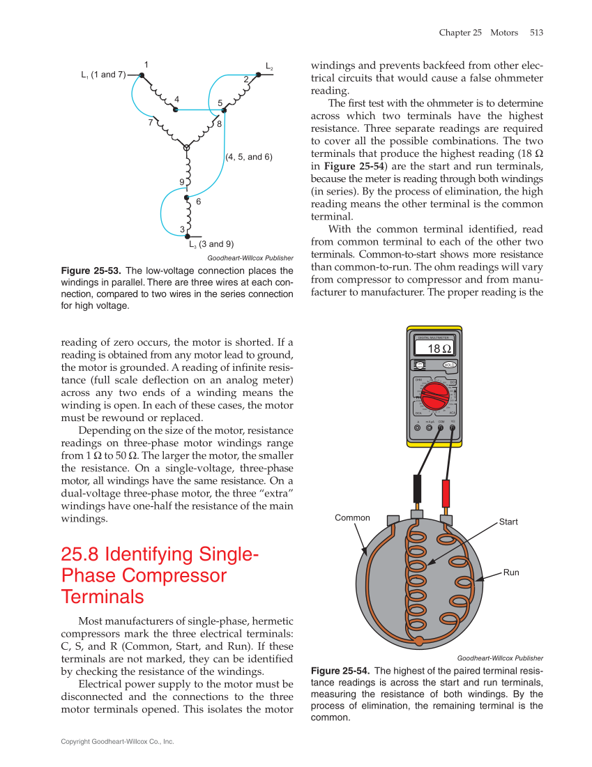windings and prevents backfeed from other elec- trical circuits that would cause a false ohmmeter reading. The first test with the ohmmeter is to determine across which two terminals have the highest resistance. Three separate readings are required to cover all the possible combinations. The two terminals that produce the highest reading (18 Ω in Figure 25‑54) are the start and run terminals, because the meter is reading through both windings (in series). By the process of elimination, the high reading means the other terminal is the common terminal. With the common terminal identified, read from common terminal to each of the other two terminals. Common-to-start shows more resistance than common-to-run. The ohm readings will vary from compressor to compressor and from manu- facturer to manufacturer. The proper reading is the reading of zero occurs, the motor is shorted. If a reading is obtained from any motor lead to ground, the motor is grounded. A reading of infinite resis- tance (full scale deflection on an analog meter) across any two ends of a winding means the winding is open. In each of these cases, the motor must be rewound or replaced. Depending on the size of the motor, resistance readings on three-phase motor windings range from 1 Ω to 50 Ω. The larger the motor, the smaller the resistance. On a single-voltage, three-phase motor, all windings have the same resistance. On a dual-voltage three-phase motor, the three “extra” windings have one-half the resistance of the main windings. 25.8 Identifying Single- Phase Compressor Terminals Most manufacturers of single-phase, hermetic compressors mark the three electrical terminals: C, S, and R (Common, Start, and Run). If these terminals are not marked, they can be identified by checking the resistance of the windings. Electrical power supply to the motor must be disconnected and the connections to the three motor terminals opened. This isolates the motor 1 4 5 2 8 7 9 6 3 (4, 5, and 6) L3 (3 and 9) L2 L1 (1 and 7) Goodheart-Willcox Publisher Figure 25‑53. The low-voltage connection places the windings in parallel. There are three wires at each con- nection, compared to two wires in the series connection for high voltage. HOLD ON OFF OHM DCV DCA A C V ACA COM VΩ A mAμA m 20 m 2 200 1k 750 20 200 2 200 200m 2m 20m 2 1010 2 100m 20m 2m 200m 0 200 2k 20k 200k 2M 20M DIGITAL MULTIMETER 18 Start Run Common Goodheart-Willcox Publisher Figure 25‑54. The highest of the paired terminal resis- tance readings is across the start and run terminals, measuring the resistance of both windings. By the process of elimination, the remaining terminal is the common. Chapter 25 Motors 513 Copyright Goodheart-Willcox Co., Inc.