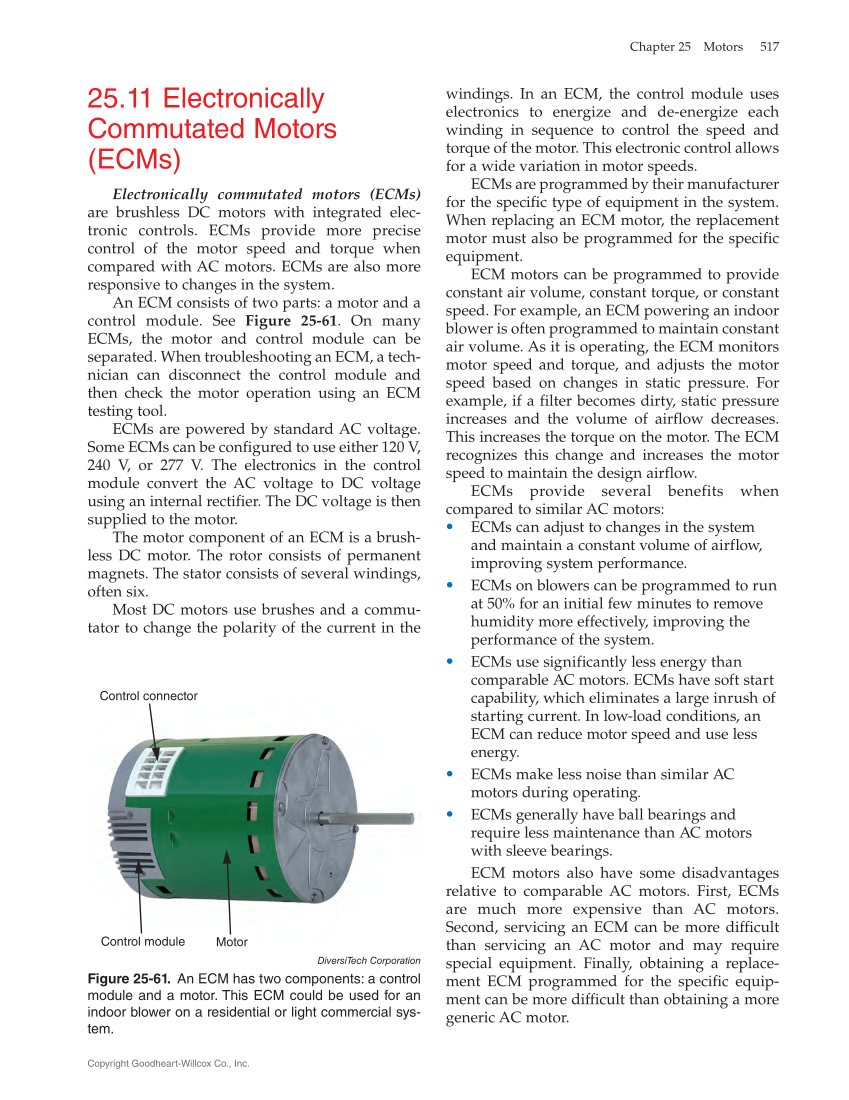 windings. In an ECM, the control module uses electronics to energize and de-energize each winding in sequence to control the speed and torque of the motor. This electronic control allows for a wide variation in motor speeds. ECMs are programmed by their manufacturer for the specific type of equipment in the system. When replacing an ECM motor, the replacement motor must also be programmed for the specific equipment. ECM motors can be programmed to provide constant air volume, constant torque, or constant speed. For example, an ECM powering an indoor blower is often programmed to maintain constant air volume. As it is operating, the ECM monitors motor speed and torque, and adjusts the motor speed based on changes in static pressure. For example, if a filter becomes dirty, static pressure increases and the volume of airflow decreases. This increases the torque on the motor. The ECM recognizes this change and increases the motor speed to maintain the design airflow. ECMs provide several benefits when compared to similar AC motors: • • ECMs can adjust to changes in the system and maintain a constant volume of airflow, improving system performance. • • ECMs on blowers can be programmed to run at 50% for an initial few minutes to remove humidity more effectively, improving the performance of the system. • • ECMs use significantly less energy than comparable AC motors. ECMs have soft start capability, which eliminates a large inrush of starting current. In low-load conditions, an ECM can reduce motor speed and use less energy. • • ECMs make less noise than similar AC motors during operating. • • ECMs generally have ball bearings and require less maintenance than AC motors with sleeve bearings. ECM motors also have some disadvantages relative to comparable AC motors. First, ECMs are much more expensive than AC motors. Second, servicing an ECM can be more difficult than servicing an AC motor and may require special equipment. Finally, obtaining a replace- ment ECM programmed for the specific equip- ment can be more difficult than obtaining a more generic AC motor. 25.11 Electronically Commutated Motors (ECMs) Electronically commutated motors (ECMs) are brushless DC motors with integrated elec- tronic controls. ECMs provide more precise control of the motor speed and torque when compared with AC motors. ECMs are also more responsive to changes in the system. An ECM consists of two parts: a motor and a control module. See Figure 25-61. On many ECMs, the motor and control module can be separated. When troubleshooting an ECM, a tech- nician can disconnect the control module and then check the motor operation using an ECM testing tool. ECMs are powered by standard AC voltage. Some ECMs can be configured to use either 120 V, 240 V, or 277 V. The electronics in the control module convert the AC voltage to DC voltage using an internal rectifier. The DC voltage is then supplied to the motor. The motor component of an ECM is a brush- less DC motor. The rotor consists of permanent magnets. The stator consists of several windings, often six. Most DC motors use brushes and a commu- tator to change the polarity of the current in the Control connector Control module Motor DiversiTech Corporation Figure 25‑61. An ECM has two components: a control module and a motor. This ECM could be used for an indoor blower on a residential or light commercial sys- tem. Chapter 25 Motors 517 Copyright Goodheart-Willcox Co., Inc.