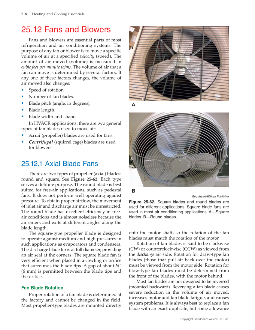 25.12 Fans and Blowers Fans and blowers are essential parts of most refrigeration and air conditioning systems. The purpose of any fan or blower is to move a specific volume of air at a specified velocity (speed). The amount of air moved (volume) is measured in cubic feet per minute (cfm). The volume of air that a fan can move is determined by several factors. If any one of these factors changes, the volume of air moved also changes: • •• Speed of rotation. •• Number of fan blades. •• Blade pitch (angle, in degrees). •• Blade length. • Blade width and shape. In HVACR applications, there are two general types of fan blades used to move air: • •• Axial (propeller) blades are used for fans. • Centrifugal (squirrel cage) blades are used for blowers. 25.12.1 Axial Blade Fans There are two types of propeller (axial) blades: round and square. See Figure 25‑62. Each type serves a definite purpose. The round blade is best suited for free-air applications, such as pedestal fans. It does not perform well operating against pressure. To obtain proper airflow, the movement of inlet air and discharge air must be unrestricted. The round blade has excellent efficiency in free- air conditions and is almost noiseless because the air enters and exits at different angles along the blade length. The square-type propeller blade is designed to operate against medium and high pressures in such applications as evaporators and condensers. The discharge blade tip is at full diameter, providing an air seal at the corners. The square blade fan is very efficient when placed in a cowling or orifice that surrounds the blade tips. A gap of about ¼″ (6 mm) is permitted between the blade tips and the orifice. Fan Blade Rotation Proper rotation of a fan blade is determined at the factory and cannot be changed in the field. Most propeller-type blades are mounted directly B A Goodheart-Willcox Publisher Figure 25‑62. Square blades and round blades are used for different applications. Square blade fans are used in most air conditioning applications. A—Square blades. B—Round blades. onto the motor shaft, so the rotation of the fan blades must match the rotation of the motor. Rotation of fan blades is said to be clockwise (CW) or counterclockwise (CCW) as viewed from the discharge air side. Rotation for draw-type fan blades (those that pull air back over the motor) must be viewed from the motor side. Rotation for blow-type fan blades must be determined from the front of the blades, with the motor behind. Most fan blades are not designed to be reversed (mounted backward). Reversing a fan blade causes severe reduction in the volume of air moved, increases motor and fan blade fatigue, and causes system problems. It is always best to replace a fan blade with an exact duplicate, but some allowance 518 Heating and Cooling Essentials Copyright Goodheart-Willcox Co., Inc.