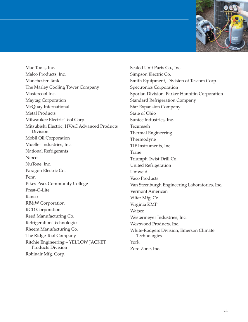 Mac Tools, Inc. Malco Products, Inc. Manchester Tank The Marley Cooling Tower Company Mastercool Inc. Maytag Corporation McQuay International Metal Products Milwaukee Electric Tool Corp. Mitsubishi Electric, HVAC Advanced Products Division Mobil Oil Corporation Mueller Industries, Inc. National Refrigerants Nibco NuTone, Inc. Paragon Electric Co. Penn Pikes Peak Community College Prest-O-Lite Ranco RB&W Corporation RCD Corporation Reed Manufacturing Co. Refrigeration Technologies Rheem Manufacturing Co. The Ridge Tool Company Ritchie Engineering – YELLOW JACKET Products Division Robinair Mfg. Corp. Sealed Unit Parts Co., Inc. Simpson Electric Co. Smith Equipment, Division of Tescom Corp. Spectronics Corporation Sporlan Division–Parker Hannifin Corporation Standard Refrigeration Company Star Expansion Company State of Ohio Suntec Industries, Inc. Tecumseh Thermal Engineering Thermodyne TIF Instruments, Inc. Trane Triumph Twist Drill Co. United Refrigeration Uniweld Vaco Products Van Steenburgh Engineering Laboratories, Inc. Vermont American Vilter Mfg. Co. Virginia KMP Watsco Westermeyer Industries, Inc. Westwood Products, Inc. White-Rodgers Division, Emerson Climate Technologies York Zero Zone, Inc. vii