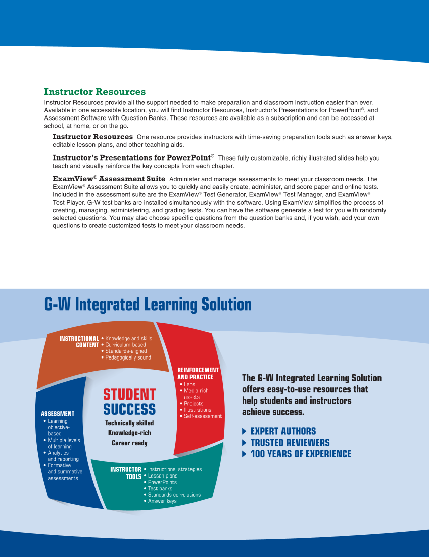 Instructor Resources Instructor Resources provide all the support needed to make preparation and classroom instruction easier than ever. Available in one accessible location, you will find Instructor Resources, Instructor’s Presentations for PowerPoint®, and Assessment Software with Question Banks. These resources are available as a subscription and can be accessed at school, at home, or on the go. Instructor Resources One resource provides instructors with time-saving preparation tools such as answer keys, editable lesson plans, and other teaching aids. Instructor’s Presentations for PowerPoint® These fully customizable, richly illustrated slides help you teach and visually reinforce the key concepts from each chapter. ExamView® Assessment Suite Administer and manage assessments to meet your classroom needs. The ExamView® Assessment Suite allows you to quickly and easily create, administer, and score paper and online tests. Included in the assessment suite are the ExamView® Test Generator, ExamView® Test Manager, and ExamView® Test Player. G-W test banks are installed simultaneously with the software. Using ExamView simplifies the process of creating, managing, administering, and grading tests. You can have the software generate a test for you with randomly selected questions. You may also choose specific questions from the question banks and, if you wish, add your own questions to create customized tests to meet your classroom needs. ASSESSMENT • Learning objective- based • Multiple levels of learning • Analytics and reporting • Formative and summative assessments • Knowledge and skills • Curriculum-based • Standards-aligned • Pedagogically sound INSTRUCTIONAL CONTENT INSTRUCTOR TOOLS • Instructional strategies • Lesson plans • PowerPoints • Test banks • Standards correlations • Answer keys REINFORCEMENT AND PRACTICE • Labs • Media-rich assets • Projects • Illustrations • Self-assessment STUDENT SUCCESS Technically skilled Knowledge-rich Career ready G-W Integrated Learning Solution The G-W Integrated Learning Solution offers easy-to-use resources that help students and instructors achieve success. EXPERT AUTHORS TRUSTED REVIEWERS 100 YEARS OF EXPERIENCE
