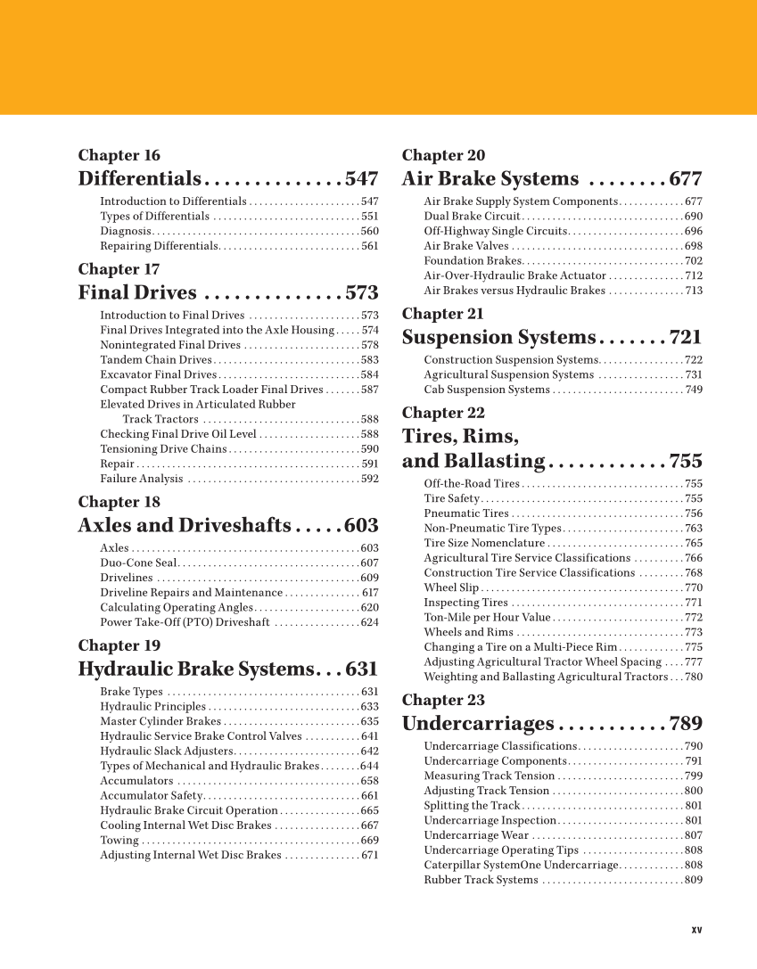 xv Chapter 16 Differentials. . . . . . . . . . . . . . 547 Introduction to Differentials . . . . . . . . . . . . . . . . . . . . . . 547 Types of Differentials . . . . . . . . . . . . . . . . . . . . . . . . . . . . . 551 Diagnosis. . . . . . . . . . . . . . . . . . . . . . . . . . . . . . . . . . . . . . . . .560 Repairing Differentials. . . . . . . . . . . . . . . . . . . . . . . . . . . . 561 Chapter 17 Final Drives . . . . . . . . . . . . . . 573 Introduction to Final Drives . . . . . . . . . . . . . . . . . . . . . . 573 Final Drives Integrated into the Axle Housing . . . . . 574 Nonintegrated Final Drives . . . . . . . . . . . . . . . . . . . . . . . 578 Tandem Chain Drives. . . . . . . . . . . . . . . . . . . . . . . . . . . . .583 Excavator Final Drives . . . . . . . . . . . . . . . . . . . . . . . . . . . .584 Compact Rubber Track Loader Final Drives . . . . . . . 587 Elevated Drives in Articulated Rubber Track Tractors . . . . . . . . . . . . . . . . . . . . . . . . . . . . . . .588 Checking Final Drive Oil Level . . . . . . . . . . . . . . . . . . . .588 Tensioning Drive Chains . . . . . . . . . . . . . . . . . . . . . . . . . . 590 Repair . . . . . . . . . . . . . . . . . . . . . . . . . . . . . . . . . . . . . . . . . . . . 591 Failure Analysis . . . . . . . . . . . . . . . . . . . . . . . . . . . . . . . . . . 592 Chapter 18 Axles and Driveshafts . . . . .603 Axles . . . . . . . . . . . . . . . . . . . . . . . . . . . . . . . . . . . . . . . . . . . . .603 Duo-Cone Seal. . . . . . . . . . . . . . . . . . . . . . . . . . . . . . . . . . . .607 Drivelines . . . . . . . . . . . . . . . . . . . . . . . . . . . . . . . . . . . . . . . .609 Driveline Repairs and Maintenance . . . . . . . . . . . . . . . 617 Calculating Operating Angles. . . . . . . . . . . . . . . . . . . . . 620 Power Take-Off (PTO) Driveshaft . . . . . . . . . . . . . . . . . 624 Chapter 19 Hydraulic Brake Systems. . . 631 Brake Types . . . . . . . . . . . . . . . . . . . . . . . . . . . . . . . . . . . . . . 631 Hydraulic Principles . . . . . . . . . . . . . . . . . . . . . . . . . . . . . .633 Master Cylinder Brakes . . . . . . . . . . . . . . . . . . . . . . . . . . . 635 Hydraulic Service Brake Control Valves . . . . . . . . . . . 641 Hydraulic Slack Adjusters. . . . . . . . . . . . . . . . . . . . . . . . . 642 Types of Mechanical and Hydraulic Brakes. . . . . . . .644 Accumulators . . . . . . . . . . . . . . . . . . . . . . . . . . . . . . . . . . . . 658 Accumulator Safety. . . . . . . . . . . . . . . . . . . . . . . . . . . . . . . 661 Hydraulic Brake Circuit Operation . . . . . . . . . . . . . . . .665 Cooling Internal Wet Disc Brakes . . . . . . . . . . . . . . . . . 667 Towing . . . . . . . . . . . . . . . . . . . . . . . . . . . . . . . . . . . . . . . . . . . 669 Adjusting Internal Wet Disc Brakes . . . . . . . . . . . . . . . 671 Chapter 20 Air Brake Systems . . . . . . . . 677 Air Brake Supply System Components. . . . . . . . . . . . . 677 Dual Brake Circuit . . . . . . . . . . . . . . . . . . . . . . . . . . . . . . . . 690 Off-Highway Single Circuits. . . . . . . . . . . . . . . . . . . . . . . 696 Air Brake Valves . . . . . . . . . . . . . . . . . . . . . . . . . . . . . . . . . . 698 Foundation Brakes. . . . . . . . . . . . . . . . . . . . . . . . . . . . . . . . 702 Air-Over-Hydraulic Brake Actuator . . . . . . . . . . . . . . . 712 Air Brakes versus Hydraulic Brakes . . . . . . . . . . . . . . . 713 Chapter 21 Suspension Systems. . . . . . . 721 Construction Suspension Systems. . . . . . . . . . . . . . . . . 722 Agricultural Suspension Systems . . . . . . . . . . . . . . . . . 731 Cab Suspension Systems . . . . . . . . . . . . . . . . . . . . . . . . . . 749 Chapter 22 Tires, Rims, and Ballasting . . . . . . . . . . . . 755 Off-the-Road Tires . . . . . . . . . . . . . . . . . . . . . . . . . . . . . . . . 755 Tire Safety . . . . . . . . . . . . . . . . . . . . . . . . . . . . . . . . . . . . . . . . 755 Pneumatic Tires . . . . . . . . . . . . . . . . . . . . . . . . . . . . . . . . . . 756 Non-Pneumatic Tire Types. . . . . . . . . . . . . . . . . . . . . . . . 763 Tire Size Nomenclature . . . . . . . . . . . . . . . . . . . . . . . . . . . 765 Agricultural Tire Service Classifications . . . . . . . . . . 766 Construction Tire Service Classifications . . . . . . . . . 768 Wheel Slip . . . . . . . . . . . . . . . . . . . . . . . . . . . . . . . . . . . . . . . . 770 Inspecting Tires . . . . . . . . . . . . . . . . . . . . . . . . . . . . . . . . . . 771 Ton-Mile per Hour Value . . . . . . . . . . . . . . . . . . . . . . . . . . 772 Wheels and Rims . . . . . . . . . . . . . . . . . . . . . . . . . . . . . . . . . 773 Changing a Tire on a Multi-Piece Rim . . . . . . . . . . . . . 775 Adjusting Agricultural Tractor Wheel Spacing . . . . 777 Weighting and Ballasting Agricultural Tractors . . . 780 Chapter 23 Undercarriages . . . . . . . . . . . 789 Undercarriage Classifications. . . . . . . . . . . . . . . . . . . . . 790 Undercarriage Components. . . . . . . . . . . . . . . . . . . . . . . 791 Measuring Track Tension . . . . . . . . . . . . . . . . . . . . . . . . . 799 Adjusting Track Tension . . . . . . . . . . . . . . . . . . . . . . . . . .800 Splitting the Track . . . . . . . . . . . . . . . . . . . . . . . . . . . . . . . . 801 Undercarriage Inspection. . . . . . . . . . . . . . . . . . . . . . . . . 801 Undercarriage Wear . . . . . . . . . . . . . . . . . . . . . . . . . . . . . .807 Undercarriage Operating Tips . . . . . . . . . . . . . . . . . . . .808 Caterpillar SystemOne Undercarriage. . . . . . . . . . . . .808 Rubber Track Systems . . . . . . . . . . . . . . . . . . . . . . . . . . . .809