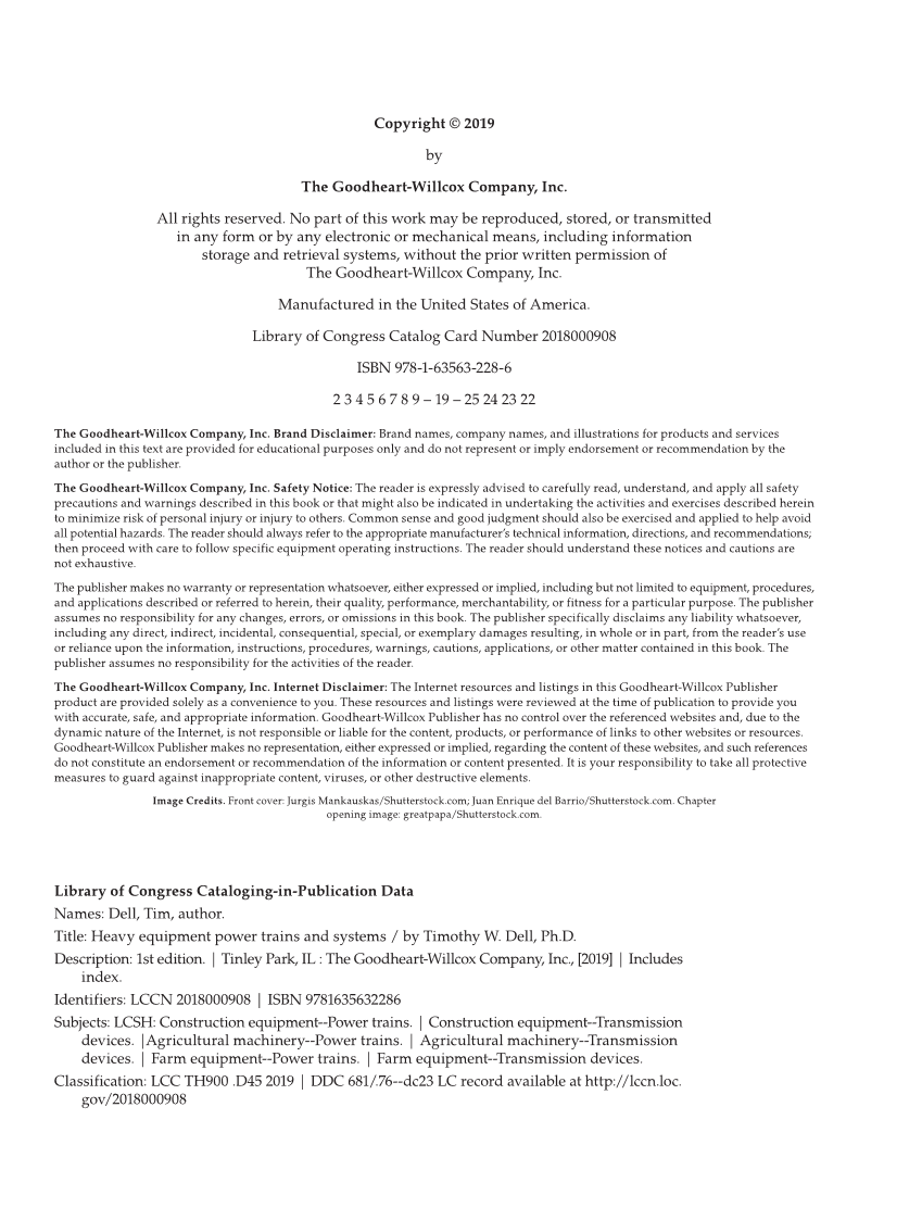 Copyright © 2019 by The Goodheart-Willcox Company, Inc. All rights reserved. No part of this work may be reproduced, stored, or transmitted in any form or by any electronic or mechanical means, including information storage and retrieval systems, without the prior written permission of The Goodheart-Willcox Company, Inc. Manufactured in the United States of America. Library of Congress Catalog Card Number 2018000908 ISBN 978-1-63563-228-6 2 3 4 5 6 7 8 9 – 19 – 25 24 23 22 The Goodheart-Willcox Company, Inc. Brand Disclaimer: Brand names, company names, and illustrations for products and services included in this text are provided for educational purposes only and do not represent or imply endorsement or recommendation by the author or the publisher. The Goodheart-Willcox Company, Inc. Safety Notice: The reader is expressly advised to carefully read, understand, and apply all safety precautions and warnings described in this book or that might also be indicated in undertaking the activities and exercises described herein to minimize risk of personal injury or injury to others. Common sense and good judgment should also be exercised and applied to help avoid all potential hazards. The reader should always refer to the appropriate manufacturer’s technical information, directions, and recommendations then proceed with care to follow specific equipment operating instructions. The reader should understand these notices and cautions are not exhaustive. The publisher makes no warranty or representation whatsoever, either expressed or implied, including but not limited to equipment, procedures, and applications described or referred to herein, their quality, performance, merchantability, or fitness for a particular purpose. The publisher assumes no responsibility for any changes, errors, or omissions in this book. The publisher specifically disclaims any liability whatsoever, including any direct, indirect, incidental, consequential, special, or exemplary damages resulting, in whole or in part, from the reader’s use or reliance upon the information, instructions, procedures, warnings, cautions, applications, or other matter contained in this book. The publisher assumes no responsibility for the activities of the reader. The Goodheart-Willcox Company, Inc. Internet Disclaimer: The Internet resources and listings in this Goodheart-Willcox Publisher product are provided solely as a convenience to you. These resources and listings were reviewed at the time of publication to provide you with accurate, safe, and appropriate information. Goodheart-Willcox Publisher has no control over the referenced websites and, due to the dynamic nature of the Internet, is not responsible or liable for the content, products, or performance of links to other websites or resources. Goodheart-Willcox Publisher makes no representation, either expressed or implied, regarding the content of these websites, and such references do not constitute an endorsement or recommendation of the information or content presented. It is your responsibility to take all protective measures to guard against inappropriate content, viruses, or other destructive elements. Image Credits. Front cover: Jurgis Mankauskas/Shutterstock.com Juan Enrique del Barrio/Shutterstock.com. Chapter opening image: greatpapa/Shutterstock.com. Library of Congress Cataloging-in-Publication Data Names: Dell, Tim, author. Title: Heavy equipment power trains and systems / by Timothy W. Dell, Ph.D. Description: 1st edition. | Tinley Park, IL : The Goodheart-Willcox Company, Inc., [2019] | Includes index. Identifiers: LCCN 2018000908 | ISBN 9781635632286 Subjects: LCSH: Construction equipment--Power trains. | Construction equipment--Transmission devices. |Agricultural machinery--Power trains. | Agricultural machinery--Transmission devices. | Farm equipment--Power trains. | Farm equipment--Transmission devices. Classification: LCC TH900 .D45 2019 | DDC 681/.76--dc23 LC record available at http://lccn.loc. gov/2018000908