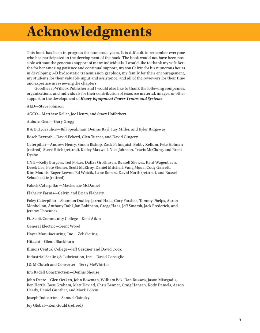 v This book has been in progress for numerous years. It is difficult to remember everyone who has participated in the development of the book. The book would not have been pos- sible without the generous support of many individuals. I would like to thank my wife Ber- tha for her amazing patience and continual support, my son Calvin for his numerous hours in developing 3-D hydrostatic transmission graphics, my family for their encouragement, my students for their valuable input and assistance, and all of the reviewers for their time and expertise in reviewing the chapters. Goodheart-Willcox Publisher and I would also like to thank the following companies, organizations, and individuals for their contribution of resource material, images, or other support in the development of Heavy Equipment Power Trains and Systems. AED—Steve Johnson AGCO—Matthew Keller, Joe Henry, and Stacy Hofferbert Auburn Gear—Gary Grogg B & B Hydraulics—Bill Speakman, Dennis Rayl, Ray Miller, and Kyler Ridgeway Bosch Rexroth—David Eckerd, Glen Turner, and David Gingery Caterpillar—Andrew Henry, Simon Bishop, Zack Palmquist, Bobby Kellum, Pete Holman (retired), Steve Hitch (retired), Kelley Maxwell, Nick Johnson, Travis McClung, and Brent Dyche CNH—Kelly Burgess, Ted Polzer, Dallas Grothusen, Russell Skewes, Kent Wagenbach, Derek Lee, Pete Steiner, Scott McElroy, Daniel Mitchell, Vang Moua, Cody Garrett, Kim Moulds, Roger Lewno, Ed Wojcik, Lane Robert, David North (retired), and Russel Schuchaskie (retired) Fabick Caterpillar—Mackenzie McDaniel Flaherty Farms—Calvin and Brian Flaherty Foley Caterpillar—Shannon Dudley, Jarrod Haas, Cory Forshee, Tommy Phelps, Aaron Monhollon, Anthony Dahl, Jon Robinson, Gregg Haas, Jeff Smarsh, Jack Frederick, and Jeremy Thoennes Ft. Scott Community College—Kent Aikin General Electric—Brent Wood Hayes Manufacturing, Inc.—Zeb Sieting Hitachi—Glenn Blackburn Illinois Central College—Jeff Gardner and David Cook Industrial Sealing & Lubrication, Inc.—David Consiglio J & M Clutch and Converter—Terry McWhirter Jim Radell Construction—Dennis Shouse John Deere—Glen Oetken, John Bowman, William Eck, Dan Russow, Jason Misegadis, Ben Hertle, Ross Graham, Matt Davied, Chris Bennet, Craig Hansen, Kody Daniels, Aaron Heady, Daniel Gunther, and Mark Colvin Joseph Industries—Samuel Osinsky Joy Global—Ken Gould (retired) Acknowledgments