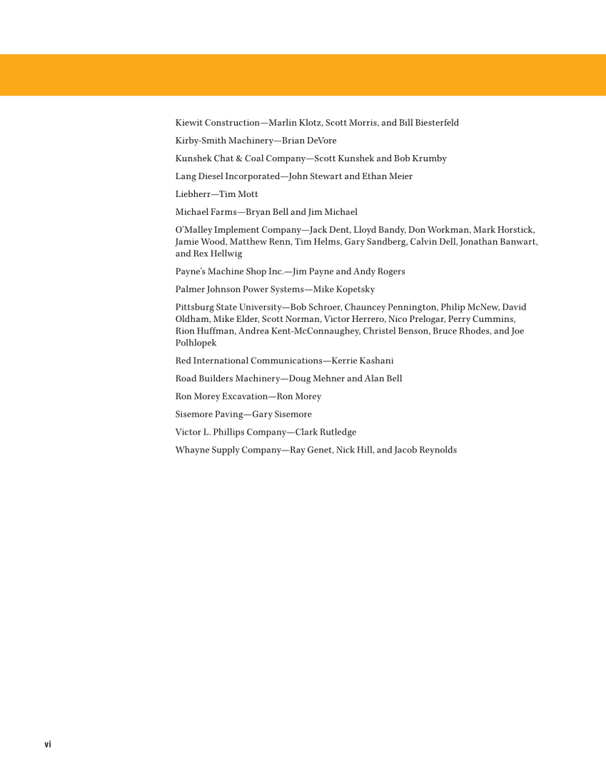 vi Kiewit Construction—Marlin Klotz, Scott Morris, and Bill Biesterfeld Kirby-Smith Machinery—Brian DeVore Kunshek Chat & Coal Company—Scott Kunshek and Bob Krumby Lang Diesel Incorporated—John Stewart and Ethan Meier Liebherr—Tim Mott Michael Farms—Bryan Bell and Jim Michael O’Malley Implement Company—Jack Dent, Lloyd Bandy, Don Workman, Mark Horstick, Jamie Wood, Matthew Renn, Tim Helms, Gary Sandberg, Calvin Dell, Jonathan Banwart, and Rex Hellwig Payne’s Machine Shop Inc.—Jim Payne and Andy Rogers Palmer Johnson Power Systems—Mike Kopetsky Pittsburg State University—Bob Schroer, Chauncey Pennington, Philip McNew, David Oldham, Mike Elder, Scott Norman, Victor Herrero, Nico Prelogar, Perry Cummins, Rion Huffman, Andrea Kent-McConnaughey, Christel Benson, Bruce Rhodes, and Joe Polhlopek Red International Communications—Kerrie Kashani Road Builders Machinery—Doug Mehner and Alan Bell Ron Morey Excavation—Ron Morey Sisemore Paving—Gary Sisemore Victor L. Phillips Company—Clark Rutledge Whayne Supply Company—Ray Genet, Nick Hill, and Jacob Reynolds