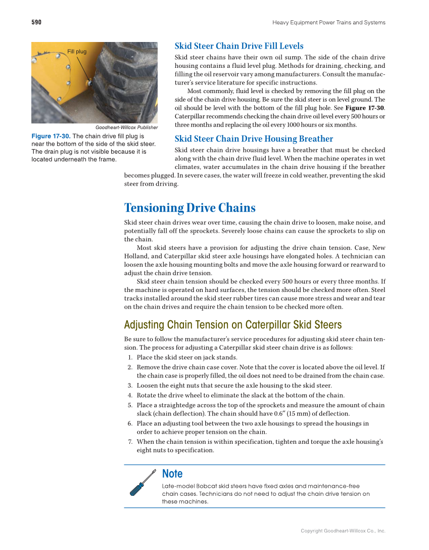 Copyright Goodheart-Willcox Co., Inc. Heavy Equipment Power Trains and Systems 590 Skid Steer Chain Drive Fill Levels Skid steer chains have their own oil sump. The side of the chain drive housing contains a fluid level plug. Methods for draining, checking, and filling the oil reservoir vary among manufacturers. Consult the manufac- turer’s service literature for specific instructions. Most commonly, fluid level is checked by removing the fill plug on the side of the chain drive housing. Be sure the skid steer is on level ground. The oil should be level with the bottom of the fill plug hole. See Figure 17-30. Caterpillar recommends checking the chain drive oil level every 500 hours or three months and replacing the oil every 1000 hours or six months. Skid Steer Chain Drive Housing Breather Skid steer chain drive housings have a breather that must be checked along with the chain drive fluid level. When the machine operates in wet climates, water accumulates in the chain drive housing if the breather becomes plugged. In severe cases, the water will freeze in cold weather, preventing the skid steer from driving. Tensioning Drive Chains Skid steer chain drives wear over time, causing the chain drive to loosen, make noise, and potentially fall off the sprockets. Severely loose chains can cause the sprockets to slip on the chain. Most skid steers have a provision for adjusting the drive chain tension. Case, New Holland, and Caterpillar skid steer axle housings have elongated holes. A technician can loosen the axle housing mounting bolts and move the axle housing forward or rearward to adjust the chain drive tension. Skid steer chain tension should be checked every 500 hours or every three months. If the machine is operated on hard surfaces, the tension should be checked more often. Steel tracks installed around the skid steer rubber tires can cause more stress and wear and tear on the chain drives and require the chain tension to be checked more often. Adjusting Chain Tension on Caterpillar Skid Steers Be sure to follow the manufacturer’s service procedures for adjusting skid steer chain ten- sion. The process for adjusting a Caterpillar skid steer chain drive is as follows: 1. Place the skid steer on jack stands. 2. Remove the drive chain case cover. Note that the cover is located above the oil level. If the chain case is properly filled, the oil does not need to be drained from the chain case. 3. Loosen the eight nuts that secure the axle housing to the skid steer. 4. Rotate the drive wheel to eliminate the slack at the bottom of the chain. 5. Place a straightedge across the top of the sprockets and measure the amount of chain slack (chain deflection). The chain should have 0.6″ (15 mm) of deflection. 6. Place an adjusting tool between the two axle housings to spread the housings in order to achieve proper tension on the chain. 7. When the chain tension is within specification, tighten and torque the axle housing’s eight nuts to specification. Note Late-model Bobcat skid steers have fixed axles and maintenance-free chain cases. Technicians do not need to adjust the chain drive tension on these machines. Goodheart-Willcox Publisher Figure 17-30. The chain drive fill plug is near the bottom of the side of the skid steer. The drain plug is not visible because it is located underneath the frame. Fill plug