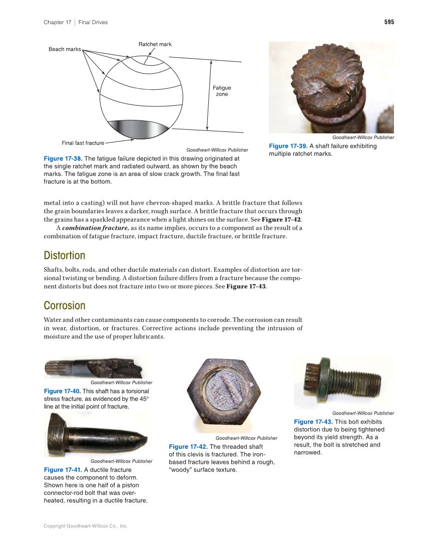 Copyright Goodheart-Willcox Co., Inc. 595 Chapter 17 ∣ Final Drives metal into a casting) will not have chevron-shaped marks. A brittle fracture that follows the grain boundaries leaves a darker, rough surface. A brittle fracture that occurs through the grains has a sparkled appearance when a light shines on the surface. See Figure 17-42. A combination fracture, as its name implies, occurs to a component as the result of a combination of fatigue fracture, impact fracture, ductile fracture, or brittle fracture. Distortion Shafts, bolts, rods, and other ductile materials can distort. Examples of distortion are tor- sional twisting or bending. A distortion failure differs from a fracture because the compo- nent distorts but does not fracture into two or more pieces. See Figure 17-43. Corrosion Water and other contaminants can cause components to corrode. The corrosion can result in wear, distortion, or fractures. Corrective actions include preventing the intrusion of moisture and the use of proper lubricants. Ratchet mark Beach marks Fatigue zone Final fast fracture Goodheart-Willcox Publisher Figure 17-39. A shaft failure exhibiting multiple ratchet marks. Goodheart-Willcox Publisher Figure 17-40. This shaft has a torsional stress fracture, as evidenced by the 45° line at the initial point of fracture. Goodheart-Willcox Publisher Figure 17-41. A ductile fracture causes the component to deform. Shown here is one half of a piston connector-rod bolt that was over- heated, resulting in a ductile fracture. Goodheart-Willcox Publisher Figure 17-42. The threaded shaft of this clevis is fractured. The iron- based fracture leaves behind a rough, “woody” surface texture. Goodheart-Willcox Publisher Figure 17-43. This bolt exhibits distortion due to being tightened beyond its yield strength. As a result, the bolt is stretched and narrowed. Goodheart-Willcox Publisher Figure 17-38. The fatigue failure depicted in this drawing originated at the single ratchet mark and radiated outward, as shown by the beach marks. The fatigue zone is an area of slow crack growth. The final fast fracture is at the bottom.