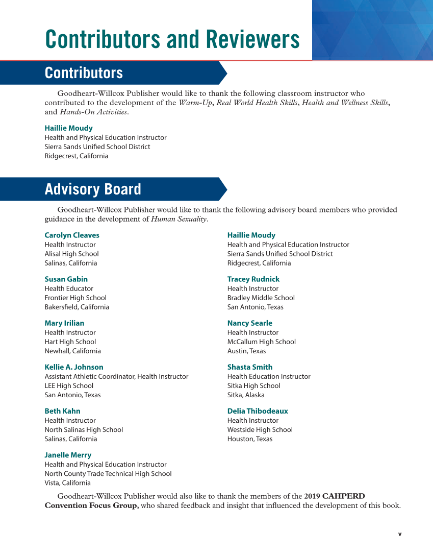 Contributors and Reviewers Contributors Contributors Goodheart-Willcox Publisher would like to thank the following classroom instructor who contributed to the development of the Warm-Up, Real World Health Skills, Health and Wellness Skills, and Hands-On Activities. Haillie Moudy Health and Physical Education Instructor Sierra Sands Unifi ed School District Ridgecrest, California Advisory Board Advisory Board Goodheart-Willcox Publisher would like to thank the following advisory board members who provided guidance in the development of Human Sexuality. Carolyn Cleaves Health Instructor Alisal High School Salinas, California Susan Gabin Health Educator Frontier High School Bakersfi eld, California Mary Irilian Health Instructor Hart High School Newhall, California Kellie A. Johnson Assistant Athletic Coordinator, Health Instructor LEE High School San Antonio, Texas Beth Kahn Health Instructor North Salinas High School Salinas, California Janelle Merry Health and Physical Education Instructor North County Trade Technical High School Vista, California Haillie Moudy Health and Physical Education Instructor Sierra Sands Unifi ed School District Ridgecrest, California Tracey Rudnick Health Instructor Bradley Middle School San Antonio, Texas Nancy Searle Health Instructor McCallum High School Austin, Texas Shasta Smith Health Education Instructor Sitka High School Sitka, Alaska Delia Thibodeaux Health Instructor Westside High School Houston, Texas Goodheart-Willcox Publisher would also like to thank the members of the 2019 CAHPERD Convention Focus Group, who shared feedback and insight that influenced the development of this book. v