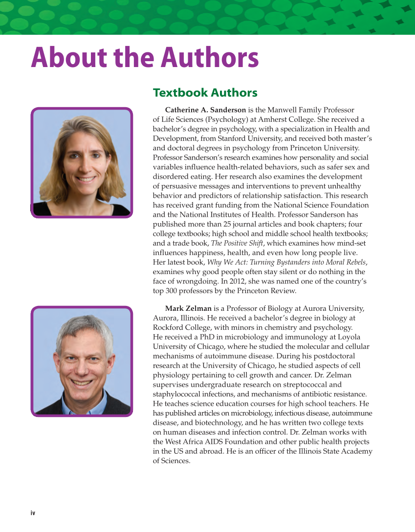 iv About the Authors Textbook Authors Catherine A. Sanderson is the Manwell Family Professor of Life Sciences (Psychology) at Amherst College. She received a bachelor’s degree in psychology, with a specialization in Health and Development, from Stanford University, and received both master’s and doctoral degrees in psychology from Princeton University. Professor Sanderson’s research examines how personality and social variables influence health-related behaviors, such as safer sex and disordered eating. Her research also examines the development of persuasive messages and interventions to prevent unhealthy behavior and predictors of relationship satisfaction. This research has received grant funding from the National Science Foundation and the National Institutes of Health. Professor Sanderson has published more than 25 journal articles and book chapters four college textbooks high school and middle school health textbooks and a trade book, The Positive Shift, which examines how mind-set influences happiness, health, and even how long people live. Her latest book, Why We Act: Turning Bystanders into Moral Rebels, examines why good people often stay silent or do nothing in the face of wrongdoing. In 2012, she was named one of the country’s top 300 professors by the Princeton Review. Mark Zelman is a Professor of Biology at Aurora University, Aurora, Illinois. He received a bachelor’s degree in biology at Rockford College, with minors in chemistry and psychology. He received a PhD in microbiology and immunology at Loyola University of Chicago, where he studied the molecular and cellular mechanisms of autoimmune disease. During his postdoctoral research at the University of Chicago, he studied aspects of cell physiology pertaining to cell growth and cancer. Dr. Zelman supervises undergraduate research on streptococcal and staphylococcal infections, and mechanisms of antibiotic resistance. He teaches science education courses for high school teachers. He has published articles on microbiology, infectious disease, autoimmune disease, and biotechnology, and he has written two college texts on human diseases and infection control. Dr. Zelman works with the West Africa AIDS Foundation and other public health projects in the US and abroad. He is an officer of the Illinois State Academy of Sciences.