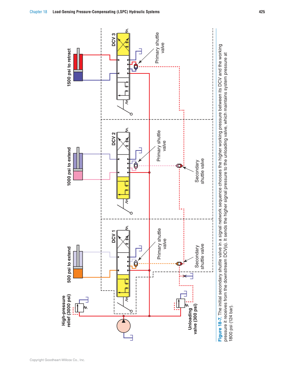 Figure 18-7. The initial secondary shuttle valve in a signal network sequence chooses the higher working pressure between its DCV and the working