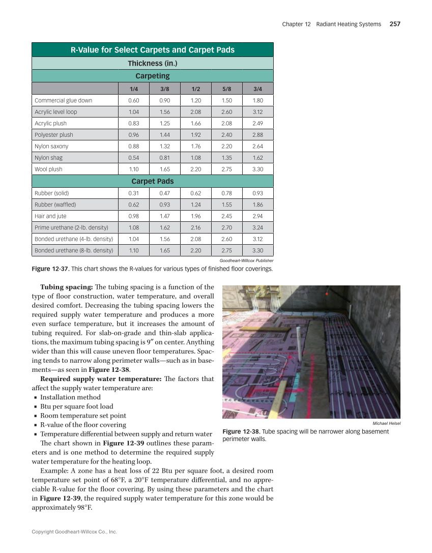 Copyright Goodheart-Willcox Co., Inc. Chapter 12 Radiant Heating Systems 257 Tubing spacing: The tubing spacing is a function of the type of floor construction, water temperature, and overall desired comfort. Decreasing the tubing spacing lowers the required supply water temperature and produces a more even surface temperature, but it increases the amount of tubing required. For slab-on-grade and thin-slab applica- tions, the maximum tubing spacing is 9″ on center. Anything wider than this will cause uneven floor temperatures. Spac- ing tends to narrow along perimeter walls—such as in base- ments—as seen in Figure 12-38. Required supply water temperature: The factors that affect the supply water temperature are: ■ ■■ Installation method ■■ Btu per square foot load ■■ Room temperature set point ■■ R-value of the floor covering ■ Temperature differential between supply and return water The chart shown in Figure 12-39 outlines these param- eters and is one method to determine the required supply water temperature for the heating loop. Example: A zone has a heat loss of 22 Btu per square foot, a desired room temperature set point of 68°F, a 20°F temperature differential, and no appre- ciable R-value for the floor covering. By using these parameters and the chart in Figure 12-39, the required supply water temperature for this zone would be approximately 98°F. Goodheart-Willcox Publisher Figure 12-37. This chart shows the R-values for various types of finished floor coverings. R-Value for Select Carpets and Carpet Pads Thickness (in.) Carpeting 1/4 3/8 1/2 5/8 3/4 Commercial glue down 0.60 0.90 1.20 1.50 1.80 Acrylic level loop 1.04 1.56 2.08 2.60 3.12 Acrylic plush 0.83 1.25 1.66 2.08 2.49 Polyester plush 0.96 1.44 1.92 2.40 2.88 Nylon saxony 0.88 1.32 1.76 2.20 2.64 Nylon shag 0.54 0.81 1.08 1.35 1.62 Wool plush 1.10 1.65 2.20 2.75 3.30 Carpet Pads Rubber (solid) 0.31 0.47 0.62 0.78 0.93 Rubber (waffled) 0.62 0.93 1.24 1.55 1.86 Hair and jute 0.98 1.47 1.96 2.45 2.94 Prime urethane (2-lb. density) 1.08 1.62 2.16 2.70 3.24 Bonded urethane (4-lb. density) 1.04 1.56 2.08 2.60 3.12 Bonded urethane (8-lb. density) 1.10 1.65 2.20 2.75 3.30 Michael Helsel Figure 12-38. Tube spacing will be narrower along basement perimeter walls.