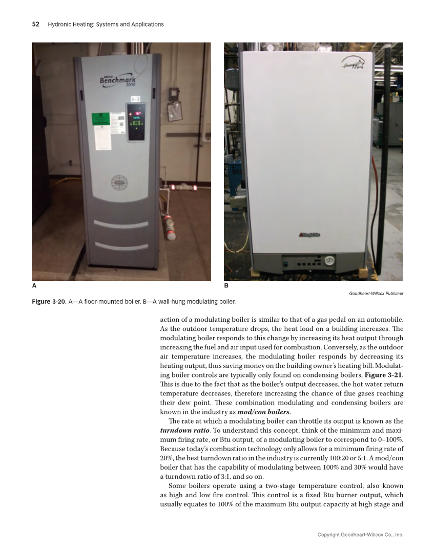 Copyright Goodheart-Willcox Co., Inc. 52 Hydronic Heating: Systems and Applications action of a modulating boiler is similar to that of a gas pedal on an automobile. As the outdoor temperature drops, the heat load on a building increases. The modulating boiler responds to this change by increasing its heat output through increasing the fuel and air input used for combustion. Conversely, as the outdoor air temperature increases, the modulating boiler responds by decreasing its heating output, thus saving money on the building owner’s heating bill. Modulat- ing boiler controls are typically only found on condensing boilers, Figure 3-21. This is due to the fact that as the boiler’s output decreases, the hot water return temperature decreases, therefore increasing the chance of flue gases reaching their dew point. These combination modulating and condensing boilers are known in the industry as mod/con boilers. The rate at which a modulating boiler can throttle its output is known as the turndown ratio. To understand this concept, think of the minimum and maxi- mum firing rate, or Btu output, of a modulating boiler to correspond to 0–100%. Because today’s combustion technology only allows for a minimum firing rate of 20%, the best turndown ratio in the industry is currently 100:20 or 5:1. A mod/con boiler that has the capability of modulating between 100% and 30% would have a turndown ratio of 3:1, and so on. Some boilers operate using a two-stage temperature control, also known as high and low fire control. This control is a fixed Btu burner output, which usually equates to 100% of the maximum Btu output capacity at high stage and A B Goodheart-Willcox Publisher Figure 3-20. A—A floor-mounted boiler. B—A wall-hung modulating boiler.