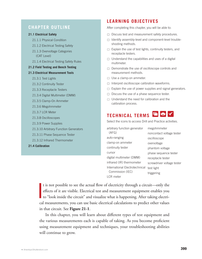 399 399 CHAPTER OUTLINE 21.1 Electrical Safety 21.1.1 Physical Condition 21.1.2 Electrical Testing Safety 21.1.3 Overvoltage Categories (CAT Level) 21.1.4 Electrical Testing Safety Rules 21.2 Field Testing and Bench Testing 21.3 Electrical Measurement Tools 21.3.1 Test Lights 21.3.2 Continuity Tester 21.3.3 Receptacle Testers 21.3.4 Digital Multimeter (DMM) 21.3.5 Clamp-On Ammeter 21.3.6 Megohmmeter 21.3.7 LCR Meter 21.3.8 Oscilloscopes 21.3.9 Power Supplies 21.3.10 Arbitrary Function Generators 21.3.11 Phase Sequence Tester 21.3.12 Infrared Thermometer 21.4 Calibration LEARNING OBJECTIVES After completing this chapter, you will be able to: □ Discuss test and measurement safety procedures. □ Identify assembly-level and component-level trouble- shooting methods. □ Explain the use of test lights, continuity testers, and receptacle testers. □ Understand the capabilities and uses of a digital multimeter. □ Demonstrate the use of oscilloscope controls and measurement methods. □ Use a clamp-on ammeter. □ Interpret oscilloscope calibration waveforms. □ Explain the use of power supplies and signal generators. □ Discuss the use of a phase sequence tester. □ Understand the need for calibration and the calibration process. TECHNICAL TERMS arbitrary function generator (AFG) auto-ranging clamp-on ammeter continuity tester cursor digital multimeter (DMM) infrared (IR) thermometer International Electrotechnical Commission (IEC) LCR meter megohmmeter noncontact voltage tester oscilloscope overvoltage phantom voltage phase sequence tester receptacle tester screwdriver voltage tester test light triggering Ito t is not possible to see the actual flow of electricity through a circuit—only the effects of it are visible. Electrical test and measurement equipment enables you “look inside the circuit” and visualize what is happening. After taking electri- cal measurements, you can use basic electrical calculations to predict other values in that circuit. See Figure 21-1. In this chapter, you will learn about different types of test equipment and the various measurements each is capable of taking. As you become proficient using measurement equipment and techniques, your troubleshooting abilities will continue to grow. Select the icons to access Drill and Practice activities. ◀ Xmentoys/Shutterstock.com Ch21.indd 399 4/26/2019 1:08:36 PM