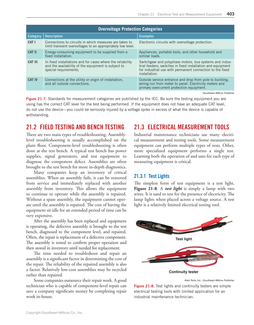 Chapter 21 Electrical Test and Measurement Equipment 403 21.2 FIELD TESTING AND BENCH TESTING Th ere are two main types of troubleshooting. Assembly- level troubleshooting is usually accomplished on the plant fl oor. Component-level troubleshooting is often done at the test bench. A typical test bench has power supplies, signal generators, and test equipment to diagnose the component defect. Assemblies are often brought to the test bench for more in-depth diagnostics. Many companies keep an inventory of critical assemblies. When an assembly fails, it can be removed from service and immediately replaced with another assembly from inventory. Th is allows the equipment to continue to operate while the assembly is repaired. Without a spare assembly, the equipment cannot oper- ate until the assembly is repaired. Th e cost of having the equipment sit idle for an extended period of time can be very expensive. After the assembly has been replaced and equipment is operating, the defective assembly is brought to the test bench, diagnosed to the component level, and repaired. Often, the repair is replacement of a defective component. Th e assembly is tested to confi rm proper operation and then stored in inventory until needed for replacement. Th e time needed to troubleshoot and repair an assembly is a signifi cant factor in determining the cost of the repair. Th e reliability of the repaired assembly is also a factor. Relatively low-cost assemblies may be recycled rather than repaired. Some companies outsource their repair work. A good technician who is capable of component-level repair can save a company signifi cant money by completing repair work in-house. 21.3 ELECTRICAL MEASUREMENT TOOLS Industrial maintenance technicians use many electri- cal measurement and testing tools. Some measurement equipment can perform multiple types of tests. Other, more specialized equipment performs a single test. Learning both the operation of and uses for each type of measuring equipment is critical. 21.3.1 Test Lights Th e simplest form of test equipment is a test light, Figure 21-8. A test light is simply a lamp with two wires. It is used to test for the presence of electricity. Th e lamp lights when placed across a voltage source. A test light is a relatively limited electrical testing tool. Continuity tester Test light Klein Tools, Inc. Goodheart-Willcox Publisher Figure 21-8. Test lights and continuity testers are simple electrical testing tools with limited application for an industrial maintenance technician. Overvoltage Protection Categories Category Description Examples CAT I Connections to circuits in which measures are taken to limit transient overvoltages to an appropriately low level. Electronic circuits with overvoltage protection. CAT II Energy-consuming equipment to be supplied from a fi xed installation. Appliances, portable tools, and other household and similar loads. CAT III In fi xed installations and for cases where the reliability and the availability of the equipment is subject to special requirements. Switchgear and polyphase motors, bus systems and indus- trial feeders switches in fi xed installation and equipment for industrial use with permanent connection to the fi xed installation. CAT IV Connections at the utility or origin of installation, and all outside connections. Outside service entrance and drop from pole to building, wiring run from meter to panel. Electricity meters and primary overcurrent protection equipment. Goodheart-Willcox Publisher Figure 21-7. Standards for measurement categories are published by the IEC. Be sure the testing equipment you are using has the correct CAT level for the test being performed. If the equipment does not have an adequate CAT level, do not use the device—you could be seriously injured by a voltage spike in excess of what the device is capable of withstanding. Copyright Goodheart-Willcox Co., Inc.