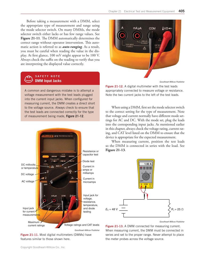 Chapter 21 Electrical Test and Measurement Equipment 405 Before taking a measurement with a DMM, select the appropriate type of measurement and range using the mode selector switch. On many DMMs, the mode selector switch either lacks or has few range values. See Figure 21-11. Th e DMM automatically determines the correct range without operator intervention. Th is auto- matic action is referred to as auto-ranging. As a result, you must be careful when reading the value in the dis- play. At fi rst glance, 100 mV might appear to be 100 V. Always check the suffi x on the reading to verify that you are interpreting the displayed value correctly. When using a DMM, fi rst set the mode selector switch to the correct setting for the type of measurement. Note that voltage and current normally have diff erent mode set- tings for AC and DC. With the mode set, plug the leads into the corresponding input jacks. As mentioned earlier in this chapter, always check the voltage rating, current rat- ing, and CAT level listed on the DMM to ensure that the device is appropriate for the expected measurement. When measuring current, position the test leads so the DMM is connected in series with the load. See Figure 21-13. S A F E T Y N O T E DMM Input Jacks A common and dangerous mistake is to attempt a voltage measurement with the test leads plugged into the current input jacks. When confi gured for measuring current, the DMM creates a direct short to the voltage source. Always check to ensure that the test leads are connected correctly for the type of measurement being made, Figure 21-12. Maximum current ratings Voltage ratings and CAT levels Input jack for voltage, resistance, temperature, and diode testing Current in microamps Input jack for current measurements Current in amps or milliamps Diode test Resistance or capacitor test DC millivolts or temperature DC voltage AC voltage Goodheart-Willcox Publisher Figure 21-11. Most digital multimeters (DMMs) have features similar to those shown here. Goodheart-Willcox Publisher Figure 21-12. A digital multimeter with the test leads appropriately connected to measure voltage or resistance. Note the two current jacks to the left of the test leads. ES = 48 V R1 = 25 Ω 1.92 A OFF A COM V Ω A V Ω Goodheart-Willcox Publisher Figure 21-13. A DMM connected for measuring current. When measuring current, the DMM must be connected in series and set to the proper range. Never attempt to place the meter probes across the voltage source. Copyright Goodheart-Willcox Co., Inc.