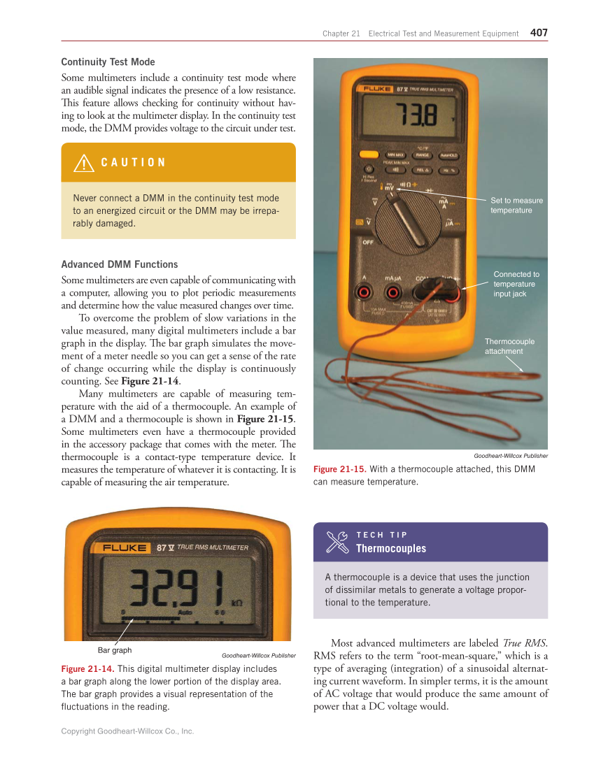 Chapter 21 Electrical Test and Measurement Equipment 407 Continuity Test Mode Some multimeters include a continuity test mode where an audible signal indicates the presence of a low resistance. Th is feature allows checking for continuity without hav- ing to look at the multimeter display. In the continuity test mode, the DMM provides voltage to the circuit under test. C A U T I O N Never connect a DMM in the continuity test mode to an energized circuit or the DMM may be irrepa- rably damaged. Advanced DMM Functions Some multimeters are even capable of communicating with a computer, allowing you to plot periodic measurements and determine how the value measured changes over time. To overcome the problem of slow variations in the value measured, many digital multimeters include a bar graph in the display. Th e bar graph simulates the move- ment of a meter needle so you can get a sense of the rate of change occurring while the display is continuously counting. See Figure 21-14. Many multimeters are capable of measuring tem- perature with the aid of a thermocouple. An example of a DMM and a thermocouple is shown in Figure 21-15. Some multimeters even have a thermocouple provided in the accessory package that comes with the meter. Th e thermocouple is a contact-type temperature device. It measures the temperature of whatever it is contacting. It is capable of measuring the air temperature. T E C H T I P Thermocouples A thermocouple is a device that uses the junction of dissimilar metals to generate a voltage propor- tional to the temperature. Most advanced multimeters are labeled True RMS. RMS refers to the term “root-mean-square,” which is a type of averaging (integration) of a sinusoidal alternat- ing current waveform. In simpler terms, it is the amount of AC voltage that would produce the same amount of power that a DC voltage would. Goodheart-Willcox Publisher Figure 21-14. This digital multimeter display includes a bar graph along the lower portion of the display area. The bar graph provides a visual representation of the fl uctuations in the reading. Thermocouple attachment Connected to temperature input jack Set to measure temperature Goodheart-Willcox Publisher Figure 21-15. With a thermocouple attached, this DMM can measure temperature. Bar graph Copyright Goodheart-Willcox Co., Inc.
