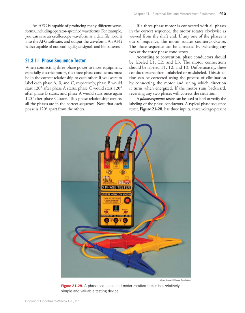Chapter 21 Electrical Test and Measurement Equipment 415 Goodheart-Willcox Publisher Figure 21-28. A phase sequence and motor rotation tester is a relatively simple and valuable testing device. An AFG is capable of producing many diff erent wave- forms, including operator-specifi ed waveforms. For example, you can save an oscilloscope waveform as a data fi le, load it into the AFG software, and output the waveform. An AFG is also capable of outputting digital signals and bit patterns. 21.3.11 Phase Sequence Tester When connecting three-phase power to most equipment, especially electric motors, the three-phase conductors must be in the correct relationship to each other. If you were to label each phase A, B, and C, respectively, phase B would start 120° after phase A starts, phase C would start 120° after phase B starts, and phase A would start once again 120° after phase C starts. Th is phase relationship ensures all the phases are in the correct sequence. Note that each phase is 120° apart from the others. If a three-phase motor is connected with all phases in the correct sequence, the motor rotates clockwise as viewed from the shaft end. If any one of the phases is out of sequence, the motor rotates counterclockwise. Th e phase sequence can be corrected by switching any two of the three phase conductors. According to convention, phase conductors should be labeled L1, L2, and L3. Th e motor connections should be labeled T1, T2, and T3. Unfortunately, these conductors are often unlabeled or mislabeled. Th is situa- tion can be corrected using the process of elimination by connecting the motor and seeing which direction it turns when energized. If the motor runs backward, reversing any two phases will correct the situation. A phase sequence tester can be used to label or verify the labeling of the phase conductors. A typical phase sequence tester, Figure 21-28, has three inputs, three voltage-present Copyright Goodheart-Willcox Co., Inc.