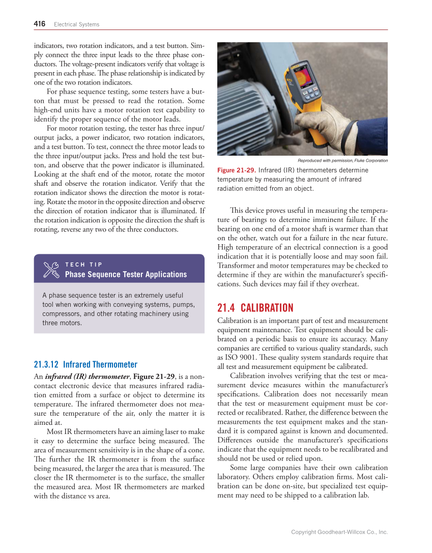 416 Electrical Systems indicators, two rotation indicators, and a test button. Sim- ply connect the three input leads to the three phase con- ductors. Th e voltage-present indicators verify that voltage is present in each phase. Th e phase relationship is indicated by one of the two rotation indicators. For phase sequence testing, some testers have a but- ton that must be pressed to read the rotation. Some high-end units have a motor rotation test capability to identify the proper sequence of the motor leads. For motor rotation testing, the tester has three input/ output jacks, a power indicator, two rotation indicators, and a test button. To test, connect the three motor leads to the three input/output jacks. Press and hold the test but- ton, and observe that the power indicator is illuminated. Looking at the shaft end of the motor, rotate the motor shaft and observe the rotation indicator. Verify that the rotation indicator shows the direction the motor is rotat- ing. Rotate the motor in the opposite direction and observe the direction of rotation indicator that is illuminated. If the rotation indication is opposite the direction the shaft is rotating, reverse any two of the three conductors. T E C H T I P Phase Sequence Tester Applications A phase sequence tester is an extremely useful tool when working with conveying systems, pumps, compressors, and other rotating machinery using three motors. 21.3.12 Infrared Thermometer An infrared (IR) thermometer, Figure 21-29, is a non- contact electronic device that measures infrared radia- tion emitted from a surface or object to determine its temperature. Th e infrared thermometer does not mea- sure the temperature of the air, only the matter it is aimed at. Most IR thermometers have an aiming laser to make it easy to determine the surface being measured. Th e area of measurement sensitivity is in the shape of a cone. Th e further the IR thermometer is from the surface being measured, the larger the area that is measured. Th e closer the IR thermometer is to the surface, the smaller the measured area. Most IR thermometers are marked with the distance vs area. Reproduced with permission, Fluke Corporation Figure 21-29. Infrared (IR) thermometers determine temperature by measuring the amount of infrared radiation emitted from an object. Th is device proves useful in measuring the tempera- ture of bearings to determine imminent failure. If the bearing on one end of a motor shaft is warmer than that on the other, watch out for a failure in the near future. High temperature of an electrical connection is a good indication that it is potentially loose and may soon fail. Transformer and motor temperatures may be checked to determine if they are within the manufacturer’s specifi - cations. Such devices may fail if they overheat. 21.4 CALIBRATION Calibration is an important part of test and measurement equipment maintenance. Test equipment should be cali- brated on a periodic basis to ensure its accuracy. Many companies are certifi ed to various quality standards, such as ISO 9001. Th ese quality system standards require that all test and measurement equipment be calibrated. Calibration involves verifying that the test or mea- surement device measures within the manufacturer’s specifi cations. Calibration does not necessarily mean that the test or measurement equipment must be cor- rected or recalibrated. Rather, the diff erence between the measurements the test equipment makes and the stan- dard it is compared against is known and documented. Diff erences outside the manufacturer’s specifi cations indicate that the equipment needs to be recalibrated and should not be used or relied upon. Some large companies have their own calibration laboratory. Others employ calibration fi rms. Most cali- bration can be done on-site, but specialized test equip- ment may need to be shipped to a calibration lab. Copyright Goodheart-Willcox Co., Inc.