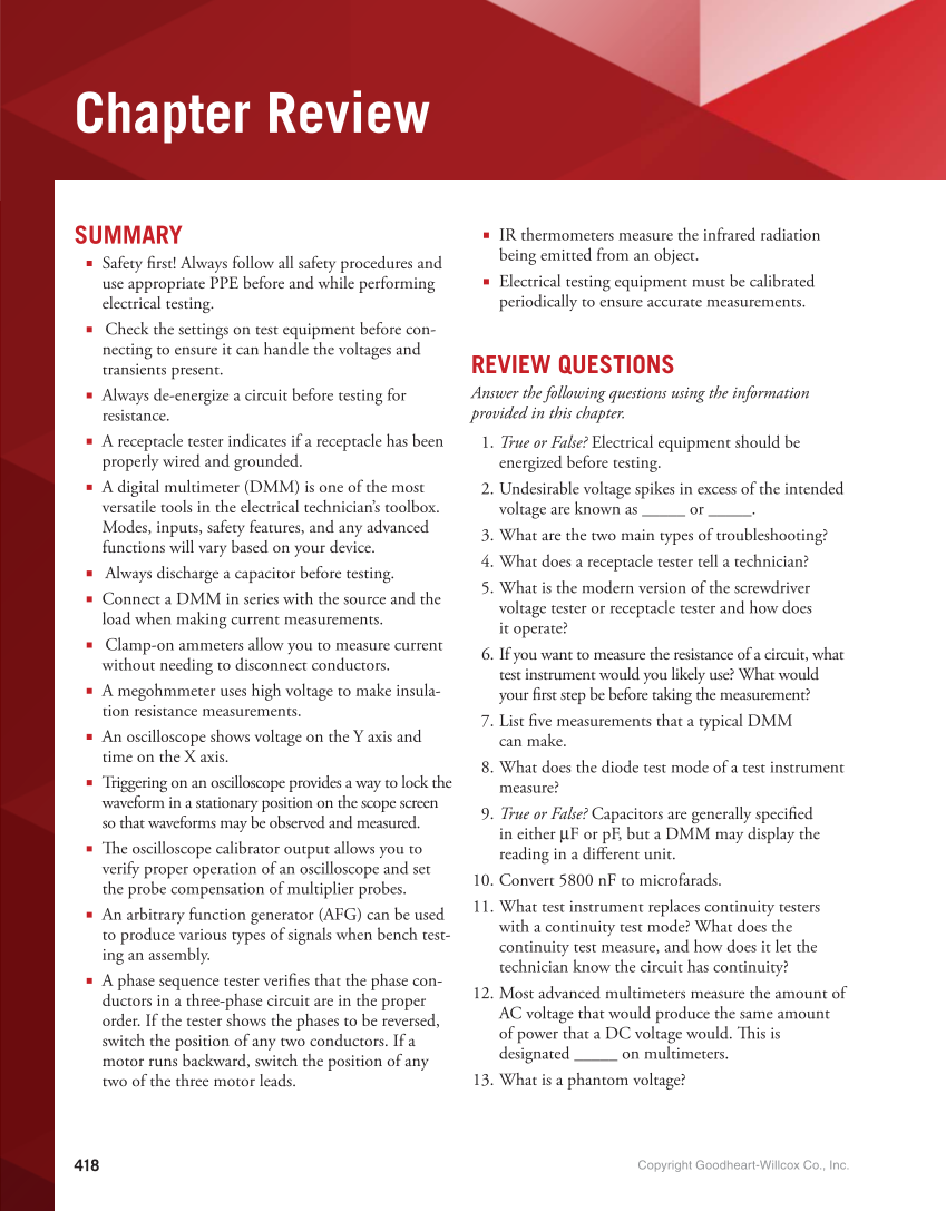 418 Chapter Review SUMMARY ■ Safety fi rst! Always follow all safety procedures and use appropriate PPE before and while performing electrical testing. ■ Check the settings on test equipment before con- necting to ensure it can handle the voltages and transients present. ■ Always de-energize a circuit before testing for resistance. ■ A receptacle tester indicates if a receptacle has been properly wired and grounded. ■ A digital multimeter (DMM) is one of the most versatile tools in the electrical technician’s toolbox. Modes, inputs, safety features, and any advanced functions will vary based on your device. ■ Always discharge a capacitor before testing. ■ Connect a DMM in series with the source and the load when making current measurements. ■ Clamp-on ammeters allow you to measure current without needing to disconnect conductors. ■ A megohmmeter uses high voltage to make insula- tion resistance measurements. ■ An oscilloscope shows voltage on the Y axis and time on the X axis. ■ Triggering on an oscilloscope provides a way to lock the waveform in a stationary position on the scope screen so that waveforms may be observed and measured. ■ Th e oscilloscope calibrator output allows you to verify proper operation of an oscilloscope and set the probe compensation of multiplier probes. ■ An arbitrary function generator (AFG) can be used to produce various types of signals when bench test- ing an assembly. ■ A phase sequence tester verifi es that the phase con- ductors in a three-phase circuit are in the proper order. If the tester shows the phases to be reversed, switch the position of any two conductors. If a motor runs backward, switch the position of any two of the three motor leads. ■ IR thermometers measure the infrared radiation being emitted from an object. ■ Electrical testing equipment must be calibrated periodically to ensure accurate measurements. REVIEW QUESTIONS Answer the following questions using the information provided in this chapter. 1. True or False? Electrical equipment should be energized before testing. 2. Undesirable voltage spikes in excess of the intended voltage are known as _____ or _____. 3. What are the two main types of troubleshooting? 4. What does a receptacle tester tell a technician? 5. What is the modern version of the screwdriver voltage tester or receptacle tester and how does it operate? 6. If you want to measure the resistance of a circuit, what test instrument would you likely use? What would your fi rst step be before taking the measurement? 7. List fi ve measurements that a typical DMM can make. 8. What does the diode test mode of a test instrument measure? 9. True or False? Capacitors are generally specifi ed in either μF or pF, but a DMM may display the reading in a diff erent unit. 10. Convert 5800 nF to microfarads. 11. What test instrument replaces continuity testers with a continuity test mode? What does the continuity test measure, and how does it let the technician know the circuit has continuity? 12. Most advanced multimeters measure the amount of AC voltage that would produce the same amount of power that a DC voltage would. Th is is designated _____ on multimeters. 13. What is a phantom voltage? Copyright Goodheart-Willcox Co., Inc.