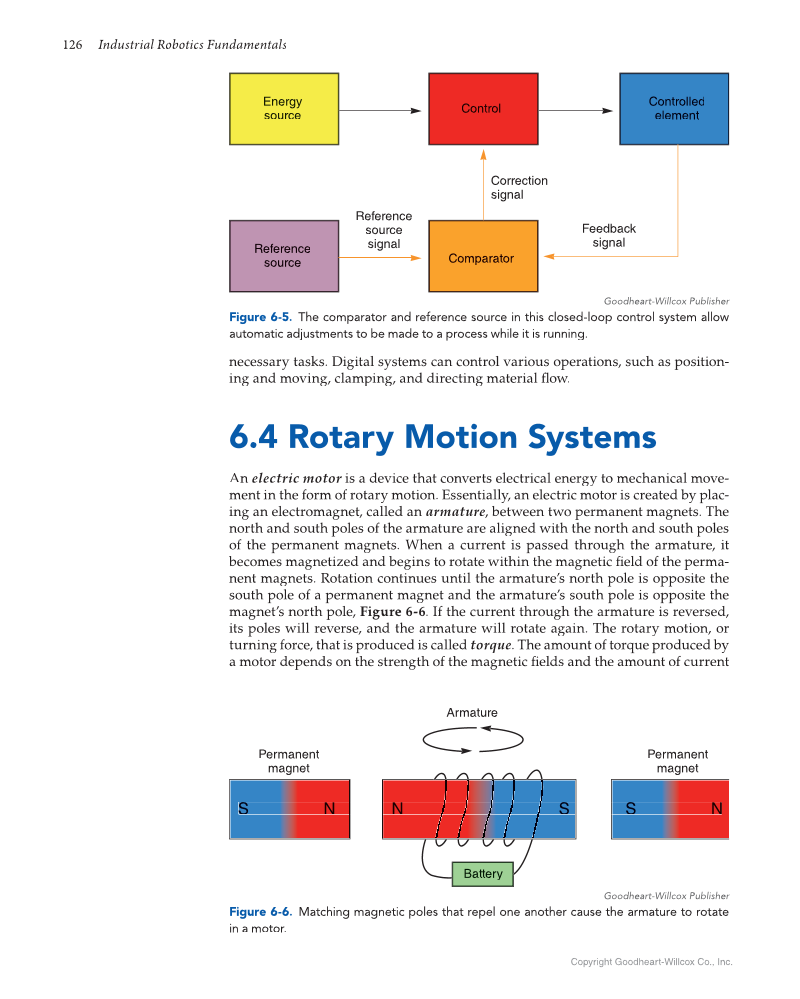 126 Industrial Robotics Fundamentals Copyright Goodheart-Willcox Co., Inc. necessary tasks. Digital systems can control various operations, such as position- ing and moving, clamping, and directing material flow. fl 6.4 Rotary Motion Systems An electric motor is a device that converts electrical energy to mechanical move- r ment in the form of rotary motion. Essentially, an electric motor is created by plac- ing an electromagnet, called an armature, between two permanent magnets. The north and south poles of the armature are aligned with the north and south poles of the permanent magnets. When a current is passed through the armature, it becomes magnetized and begins to rotate within the magnetic field of the perma- fi nent magnets. Rotation continues until the armature’s north pole is opposite the south pole of a permanent magnet and the armature’s south pole is opposite the magnet’s north pole, Figure 6-6. If the current through the armature is reversed, its poles will reverse, and the armature will rotate again. The rotary motion, or turning force, that is produced is called torque. The amount of torque produced by a motor depends on the strength of the magnetic fields and the amount of current fi Energy source Reference source Controlled element Control Comparator Feedback signal Reference source signal Correction signal Goodheart-Willcox Publisher Figure 6-5. The comparator and reference source in this closed-loop control system allow automatic adjustments to be made to a process while it is running. Armature Battery Permanent magnet Permanent magnet S N S S N N Goodheart-Willcox Publisher Figure 6-6. Matching magnetic poles that repel one another cause the armature to rotate in a motor.