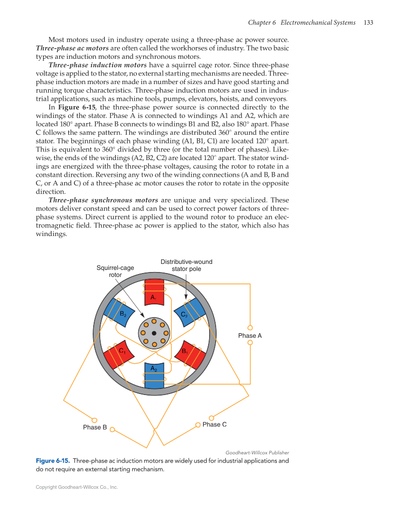 Chapter 6 Electromechanical Systems 133 Copyright Goodheart-Willcox Co., Inc. Most motors used in industry operate using a three-phase ac power source. Three-phase ac motors are often called the workhorses of industry. The two basic types are induction motors and synchronous motors. Three-phase induction motors have a squirrel cage rotor. Since three-phase voltage is applied to the stator, no external starting mechanisms are needed. Three- phase induction motors are made in a number of sizes and have good starting and running torque characteristics. Three-phase induction motors are used in indus- trial applications, such as machine tools, pumps, elevators, hoists, and conveyors. In Figure 6-15, the three-phase power source is connected directly to the windings of the stator. Phase A is connected to windings A1 and A2, which are located 180° apart. Phase B connects to windings B1 and B2, also 180° apart. Phase C follows the same pattern. The windings are distributed 360° around the entire stator. The beginnings of each phase winding (A1, B1, C1) are located 120° apart. This is equivalent to 360° divided by three (or the total number of phases). Like- wise, the ends of the windings (A2, B2, C2) are located 120° apart. The stator wind- ings are energized with the three-phase voltages, causing the rotor to rotate in a constant direction. Reversing any two of the winding connections (A and B, B and C, or A and C) of a three-phase ac motor causes the rotor to rotate in the opposite direction. Three-phase synchronous motors are unique and very specialized. These motors deliver constant speed and can be used to correct power factors of three- phase systems. Direct current is applied to the wound rotor to produce an elec- tromagnetic field. Three-phase ac power is applied to the stator, which also has fi windings. Squirrel-cage rotor A1 A2 C2 B1 C1 B2 Distributive-wound stator pole Phase A Phase C Phase B Goodheart-Willcox Publisher Figure 6-15. Three-phase ac induction motors are widely used for industrial applications and do not require an external starting mechanism.