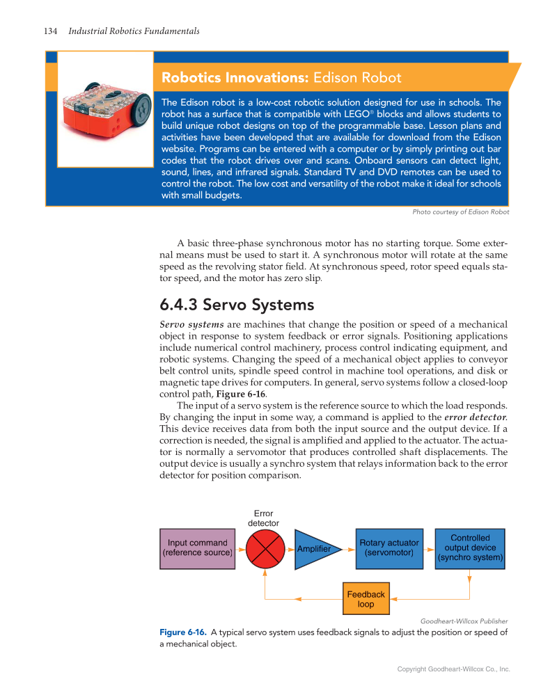 134 Industrial Robotics Fundamentals Copyright Goodheart-Willcox Co., Inc. A basic three-phase synchronous motor has no starting torque. Some exter- nal means must be used to start it. A synchronous motor will rotate at the same speed as the revolving stator fi eld. At synchronous speed, rotor speed equals sta- fi tor speed, and the motor has zero slip. 6.4.3 Servo Systems Servo systems are machines that change the position or speed of a mechanical object in response to system feedback or error signals. Positioning applications include numerical control machinery, process control indicating equipment, and robotic systems. Changing the speed of a mechanical object applies to conveyor belt control units, spindle speed control in machine tool operations, and disk or magnetic tape drives for computers. In general, servo systems follow a closed-loop control path, Figure 6-16. The input of a servo system is the reference source to which the load responds. By changing the input in some way, a command is applied to the error detector.r r This device receives data from both the input source and the output device. If a correction is needed, the signal is amplified and applied to the actuator. The actua- fi tor is normally a servomotor that produces controlled shaft displacements. The output device is usually a synchro system that relays information back to the error detector for position comparison. Robotics Innovations: Edison Robot The Edison robot is a low-cost robotic solution designed for use in schools. The robot has a surface that is compatible with LEGO® blocks and allows students to build unique robot designs on top of the programmable base. Lesson plans and activities have been developed that are available for download from the Edison website. Programs can be entered with a computer or by simply printing out bar codes that the robot drives over and scans. Onboard sensors can detect light, sound, lines, and infrared signals. Standard TV and DVD remotes can be used to control the robot. The low cost and versatility of the robot make it ideal for schools with small budgets. Photo courtesy of Edison Robot Input command (reference source) Rotary actuator (servomotor) Controlled output device (synchro system) Error detector Feedback loop Amplifier Goodheart-Willcox Publisher Figure 6-16. A typical servo system uses feedback signals to adjust the position or speed of a mechanical object.
