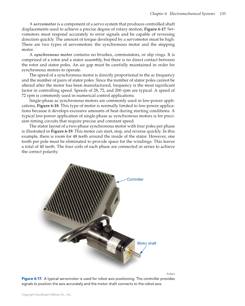 Chapter 6 Electromechanical Systems 135 Copyright Goodheart-Willcox Co., Inc. A servomotor is a component of a servo system that produces controlled shaft r displacements used to achieve a precise degree of rotary motion, Figure 6-17. Ser- 7 7 vomotors must respond accurately to error signals and be capable of reversing direction quickly. The amount of torque developed by a servomotor must be high. There are two types of servomotors: the synchronous motor and the stepping motor. A synchronous motor contains no brushes, commutators, or slip rings. It is r comprised of a rotor and a stator assembly, but there is no direct contact between the rotor and stator poles. An air gap must be carefully maintained in order for synchronous motors to operate. The speed of a synchronous motor is directly proportional to the ac frequency and the number of pairs of stator poles. Since the number of stator poles cannot be altered after the motor has been manufactured, frequency is the most significantfi factor in controlling speed. Speeds of 28, 72, and 200 rpm are typical. A speed of 72 rpm is commonly used in numerical control applications. Single-phase ac synchronous motors are commonly used in low-power appli- cations, Figure 6-18. This type of motor is normally limited to low-power applica- tions because it develops excessive amounts of heat during starting conditions. A typical low-power application of single-phase ac synchronous motors is for preci- sion timing circuits that require precise and constant speed. The stator layout of a two-phase synchronous motor with four poles per phase is illustrated in Figure 6-19. This motor can start, stop, and reverse quickly. In this example, there is room for 48 teeth around the inside of the stator. However, one tooth per pole must be eliminated to provide space for the windings. This leaves a total of 40 teeth. The four coils of each phase are connected in series to achieve the correct polarity. Controller Motor shaft Adept Figure 6-17. A typical servomotor is used for robot axis positioning. The controller provides signals to position the axis accurately and the motor shaft connects to the robot axis.