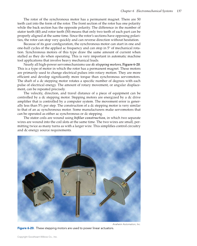 Chapter 6 Electromechanical Systems 137 Copyright Goodheart-Willcox Co., Inc. The rotor of the synchronous motor has a permanent magnet. There are 50 teeth cast into the form of the rotor. The front section of the rotor has one polarity while the back section has the opposite polarity. The difference in the number of stator teeth (40) and rotor teeth (50) means that only two teeth of each part can be properly aligned at the same time. Since the rotor’s sections have opposing polari- ties, the rotor can stop very quickly and can reverse direction without hesitation. Because of its gear confi the synchronous motor can start in one and figuration, one-half cycles of the applied ac frequency and can stop in 5° of mechanical rota- tion. Synchronous motors of this type draw the same amount of current when stalled as they do when operating. This is very important in automatic machine tool applications that involve heavy mechanical loads. Nearly all high-power servomechanisms use dc stepping motors, Figure 6-20. This is a type of motor in which the rotor has a permanent magnet. These motors are primarily used to change electrical pulses into rotary motion. They are more efficient and develop significantly fi more torque than synchronous servomotors. fi The shaft of a dc stepping motor rotates a specifi number of degrees with each fic pulse of electrical energy. The amount of rotary movement, or angular displace- ment, can be repeated precisely. The velocity, direction, and travel distance of a piece of equipment can be controlled by a dc stepping motor. Stepping motors are energized by a dc drive amplifier that is controlled by a computer system. The movement error is gener- fi ally less than 5% per step. The construction of a dc stepping motor is very similar to that of an ac synchronous motor. Some manufacturers make servomotors that can be operated as either ac synchronous or dc stepping. The stator coils are wound using bifilar construction, fi in which two separate wires are wound into the coil slots at the same time. The two wires are small, per- mitting twice as many turns as with a larger wire. This simplifi control circuitry fies and dc energy source requirements. Anaheim Automation, Inc. Figure 6-20. These stepping motors are used to power linear actuators.