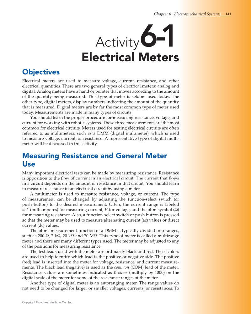 Chapter 6 Electromechan e r m m a ni cal a S Sy s st e e em s s 141 Copyright Goodheart-Willcox Co., Inc. Copyright Goodheart-Willcox Co., Inc. Activity 61- Electrical Meters Objectives Electrical meters are used to measure voltage, current, resistance, and other electrical quantities. There are two general types of electrical meters: analog and digital. Analog meters have a hand or pointer that moves according to the amount of the quantity being measured. This type of meter is seldom used today. The other type, digital meters, display numbers indicating the amount of the quantity that is measured. Digital meters are by far the most common type of meter used today. Measurements are made in many types of circuits. You should learn the proper procedure for measuring resistance, voltage, and current for working with robotic systems. These three measurements are the most common for electrical circuits. Meters used for testing electrical circuits are often referred to as multimeters, such as a DMM (digital multimeter), which is used to measure voltage, current, or resistance. A representative type of digital multi- meter will be discussed in this activity. Measuring Resistance and General Meter Use Many important electrical tests can be made by measuring resistance. Resistance is opposition to the flow of current in an electrical circuit. The current that flows fl fl in a circuit depends on the amount of resistance in that circuit. You should learn to measure resistance in an electrical circuit by using a meter. A multimeter is used to measure resistance, voltage, or current. The type of measurement can be changed by adjusting the function-select switch (or push button) to the desired measurement. Often, the current range is labeled mA (milliamperes) for measuring current, V for voltage, and the ohm symbol (Ω) V for measuring resistance. Also, a function-select switch or push button is pressed so that the meter may be used to measure alternating current (ac) values or direct current (dc) values. The ohms measurement function of a DMM is typically divided into ranges, such as 200 Ω, 2 kΩ, 20 kΩ and 20 MΩ. This type of meter is called a multirange meter and there are many different types used. The meter may be adjusted to any of the positions for measuring resistance. The test leads used with the meter are ordinarily black and red. These colors are used to help identify which lead is the positive or negative side. The positive (red) lead is inserted into the meter for voltage, resistance, and current measure- ments. The black lead (negative) is used as the common (COM) lead of the meter. Resistance values are sometimes indicated as K ohms (multiply by 1000) on the digital scale of the meter for some of the resistance ranges of the meter. Another type of digital meter is an autoranging meter. The range values do not need to be changed for larger or smaller voltages, currents, or resistances. To