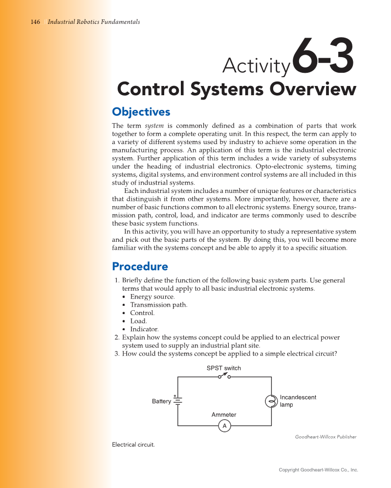 146 6 damentals Industri I d d s ia l l Rob o bo tics i s Fu un Copyright Goodheart-Willcox Co., Inc. Copyright Goodheart-Willcox Co., Inc. Activity 6-3 Control Systems Overview Objectives The term system is commonly defined as a combination of parts that work fi together to form a complete operating unit. In this respect, the term can apply to a variety of different systems used by industry to achieve some operation in the manufacturing process. An application of this term is the industrial electronic system. Further application of this term includes a wide variety of subsystems under the heading of industrial electronics. Opto-electronic systems, timing systems, digital systems, and environment control systems are all included in this study of industrial systems. Each industrial system includes a number of unique features or characteristics that distinguish it from other systems. More importantly, however, there are a number of basic functions common to all electronic systems. Energy source, trans- mission path, control, load, and indicator are terms commonly used to describe these basic system functions. In this activity, you will have an opportunity to study a representative system and pick out the basic parts of the system. By doing this, you will become more familiar with the systems concept and be able to apply it to a specific situation. fi Procedure 1. Briefl y define fl the function of the following basic system parts. Use general fi terms that would apply to all basic industrial electronic systems. • Energy source. • Transmission path. • Control. • Load. • Indicator. 2. Explain how the systems concept could be applied to an electrical power system used to supply an industrial plant site. 3. How could the systems concept be applied to a simple electrical circuit? + A SPST switch Ammeter Incandescent lamp Battery Goodheart-Willcox Publisher Electrical circuit.